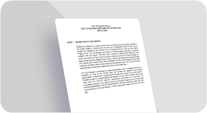 CITY OF LAGUNA NIGUEL NOTE TO REQUIRED SUPPLEMENTARY INFORMATION JUNE 30, 2024 NOTE 1 BUDGET POLICY AND CONTROL Budgets are adopted on a basis consistent with accounting principles generally accepted in the United States of America and are used as a management control device. Annual budgets are adopted for the General Fund, all Special Revenue Funds, and the Capital Projects Fund. The City Manager and Director of Finance prepare and submit a proposed budget to the City Council. The City Council conducts a noticed public hearing to invite public input before the City Council conducts its detailed review of the proposed budget at a special meeting where additional public input is invited. After reviewing the proposed budget and making such revisions that it deems advisable, the City Council approves each year's budget by resolution before the first meeting of the new fiscal year. The City Council has the legal authority to amend the budget at any time during the fiscal year. The City Manager is authorized to adjust appropriations within or between functions or programs as long as the transfer does not increase the adopted annual budget appropriations. Adjustments to appropriations between funds require City Council approval. Transfers of each or unappropriated fund balance from one fund to another can only be made with City Council's approval. Unexpended appropriations for authorized, but uncompleted, projects in the Capital Improvement Program budget and some unexpended operating appropriations can be carried forward to the next succeeding budget year upon recommendation of the City Manager. All other appropriations lapse at the end of the fiscal year. (76)