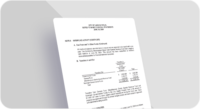 CITY OF LAGUNA NIGUEL NOTES TO BASIC FINANCIAL STATEMENTS JUNE 30, 2024 NOTE 6 INTERFUND ACTIVITY (CONTINUED) A. Due From and To Other Funds (Continued) balances are short-term in nature and are expected to be repaid within one All interfund year. The Community Development Block Grant Special Revenue Fund had a negative ce at June 30, 2024. This amount has been reclassifi cash balan ed as interfund receivables/payables for financial statement purposes. B. Transfers In and Out Transfers In Governmental Funds City Capital Transfers Out Projects Total Governmental Funds: General Fund $ 3,625,099 $ 3,625,099 Miscellaneous Grants Special Revenue Fund 2,790,751 2,790,751 Nonmajor Governmental Funds 5,245,297 5,245,297 Total $ 11,661,147 $ 11,661,147 Transfers fr om General Fund, Miscellaneous Grants Special Revenue Fund and Nonmajor Governmental Funds to the City Capital Projects Fund in the amount of $11,661,147 were to cover capital project expenditures during the fiscal year. These projects are approved through the annual budget process and each project is approved with identified funding sources. NOTE 7 LONG-TERM LIABILITIES Summary of changes in long-term liabilities for the year ended June 30, 2024 is as follows: Balance Balance Due Within Due in More July 1, 2023 Additions Deletions June 30, 2024 One Year Than One Year Governmental Activities: Subscription Payable $ - $ 167,088 $ 167- $ ,088 $ 122,898 $ 44,190 Leases Payable 270,521 - 184(86,222) ,299 86,222 98,077 Compensated Absences 795,561 428,589 647(576,710) ,440 498,524 148,916 Total Governmental Activities $ 1,066,082 $ 595,677 $ (662,932) $ 998,827 $ 707,644 $ 291,183 (57)