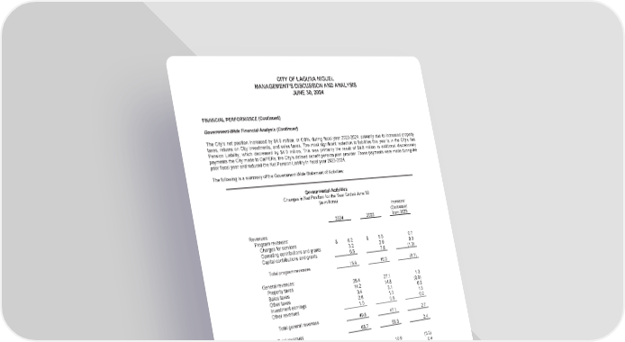 CITY OF LAGUNA NIGUEL MANAGEMENT’S DISCUSSION AND ANALYSIS JUNE 30, 2024 FINANCIAL PERFORMANCE (Continued) Government-Wide Financial Analysis (Continued) The City’s net position increased by $4.9 million, or 0.8%, during fiscal year 2023-2024, primarily due to increased property taxes, returns on City investments, and sales taxes. The most significant reduction to liabilities this year is in the City’s Net Pension Liability, which decreased by $4.0 million. This was primarily the result of $4.8 million in additional discretionary payments the City made to CalPERs, the City’s defined benefit pension plan provider. Those payments were made during the prior fiscal year and reduced the Net Pension Liability in fiscal year 2023-2024. The following is a summary of the Government-Wide Statement of Activities: Governmental Activities Changes in Net Position for the Year Ended June 30 (in millions) Increase/ (Decrease) 2024 2023 from 2023 Revenues: Program revenues: Charges for services $ 6.2 $ 5.5 0.7 Operating contributions and grants 3.2 2.9 0.3 Capital contributions and grants 6.5 7.8 (1.3) Total program revenues 15.9 16.2 (0.3) General revenues: Property taxes 28.4 27.1 1.3 Sales taxes 14.2 14.8 (0.6) Other taxes 3.4 3.1 0.3 Investment earnings 2.8 1.3 1.5 Other revenues 1.0 0.8 0.2 Total general revenues 49.8 47.1 2.7 Total revenues 65.7 63.3 2.4 Program expenses: General government 7.7 10.9 (3.2) Public safety 17.9 17.5 0.4 Community development 5.4 3.6 1.8 Parks and recreation 6.9 7.9 (1.0) Public works 22.9 17.4 5.5 Total expenses 60.8 57.3 3.5 Increase/(decrease) in net position 4.9 6.0 (1.1) Beginning net position 624.6 618.6 6.0 Ending net position $ 629.5 $ 624.6 4.9 (9)