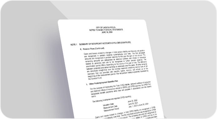 CITY OF LAGUNA NIGUEL NOTES TO BASIC FINANCIAL STATEMENTS JUNE 30, 2024 NOTE 1 SUMMARY OF SIGNIFICANT ACCOUNTING POLICIES (CONTINUED) K. Pension Plans (Continued) lated to changes in total pension liability and fiduciary net po Gains and losses re sition sion expense systematically over time. The first amortized are recognized in pen amounts are recognized in pension expense for the year the gain or loss occurs. The remaining amounts are categorized as deferred outflows and inflows of resources related to pensions and are to be recognized in further pension expense. The amortization period differs depending on the source of the gain or loss. The difference between projected and actual earnings is amortized over five years. All other amounts are amortized straight-line over th all e average expected remaining service lives of members t ctive, and retired) as of the hat are provided with benefits (active, ina the measurement period. The net pension liability is generally liquidated by beginning of the General Fund. L. Other Postemployment Benefits Plan For the purpose of measuring the s of resources Total OPEB liability, deferred outflow and deferred inflows of resources related to OPEB, and OPEB expense, the OPEB Plan recognizes benefit payments when due and payable in accordance with the benefit terms. The following timeframes are reported OPEB reporting: Valuation D ate June 30, 2022 Measurement Date June 30, 2024 Measurement Period July 1, 2023 to June 30, 2024 Gains and losses related to changes in total OPEB liability are recognized in OPEB expense systematically over time. The first amortized amounts are recognized in OPEB expense for the year the gain or loss occurs. The remaining amounts are categorized as deferred outflows and deferred inflows of resources related to OPEB and are to be recognized in future OPEB expense. Gain and loss are amortized on a straight-line basis over the average expected remaining service lives of all members that are provided with benefits (active, inactive, and retired) at the beginning of the measurement period. Other postemployment benefits are generally liquidated by the General Fund. M. Property Taxes Property tax revenue is recognized in the fiscal year for which the taxes have been levied providing they become available. Available means due, or past due and receivable within the current period and collected within the current period or expected to be collected soon enough thereafter (not to exceed 60 days) to be used to pay liabilities in the current period. (45)