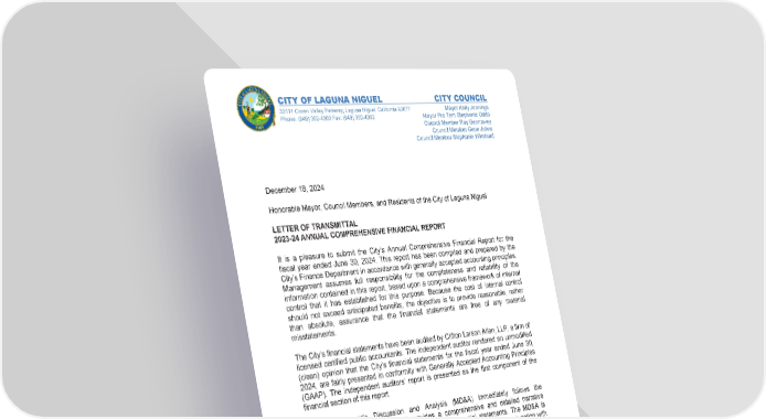 CITY OF LAGUNA NIGUEL CITY COUNCIL 30111 Crown Valley Parkway, Laguna Niguel, California 92677 Mayor Kelly Jennings Phone: (949) 362-4300 Fax: (949) 362-4352 Mayor Pro Tem Stephanie Oddo Council Member Ray Gennawey Council Member Gene Johns Council Member Stephanie Winstead December 18, 2024 Honorable Mayor, Council Members, and Residents of the City of Laguna Niguel LETTER OF TRANSMITTAL 2023-24 ANNUAL COMPREHENSIVE FINANCIAL REPORT It is a pleasure to submit the City’s Annual Comprehensive Financial Report for the fiscal year ended June 30, 2024. This report has been compiled and prepared by the City’s Finance Department in accordance with generally accepted accounting principles. Management assumes full responsibility for the completeness and reliability of the information contained in this report, based upon a comprehensive framework of internal control that it has established for this purpose. Because the cost of internal control should not exceed anticipated benefits, the objective is to provide reasonable, rather than absolute, assurance that the financial statements are free of any material misstatements. The City’s financial statements have been audited by Clifton Larson Allen, LLP, a firm of licensed certified public accountants. The independent auditor rendered an unmodified (clean) opinion that the City’s financial statements for the fiscal year ended June 30, 2024, are fairly presented in conformity with Generally Accepted Accounting Principles (GAAP). The independent auditors’ report is presented as the first component of the financial section of this report. The Management’s Discussion and Analysis (MD&A) immediately follows the independent auditors’ report and provides a comprehensive and detailed narrative introduction, overview, and analysis of the basic financial statements. The MD&A is designed to complement this letter of transmittal and should be read in conjunction with it. GENERAL INFORMATION ABOUT LAGUNA NIGUEL The City of Laguna Niguel was incorporated on December 1, 1989. The City is a master-planned community encompassing 14.72 square miles in the coastal area of South Orange County, California. As of January 2024, the State of California Department of Finance projected the City’s population as 64,291. The City is primarily a residential community supported by a strong retail and commercial base. Over one-third of Laguna Niguel’s geographic area is permanently designated as open space. This is one of the key features that define the character and urban form of the City. i