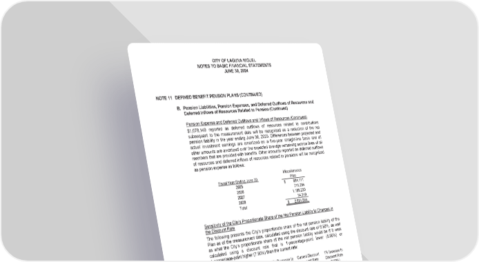 CITY OF LAGUNA NIGUEL NOTES TO BASIC FINANCIAL STATEMENTS JUNE 30, 2024 NOTE 11 DEFINED BENEFIT PENSION PLANS (CONTINUED) B. Pension Liabilities, Pension Expenses, and Deferred Outflows of Resources and Deferred Inflows of Resources Related to Pension (Continued) Pension Expense and Deferred Outflows and Inflows of Resources (Continued) $1,078,149 reported as deferred outflows of resources related to contributions subsequent to the measurement date will be recognized as a reduction of the net pension liability in the year ending June 30, 2025. Differences between projected and actual investment earnings are amortized on a five-year straight-line basis and all other amounts are amortized over the expected average remaining service lives of all members that are provided with benefits. Other amounts reported as deferred outflows of resources and deferred inflows of resources related to pensions will be recognized as pension expense as follows: Miscellaneous Fiscal Year Ending June 30, Plan 2025 $ 884,111 2026 715,284 2027 1,168,230 2028 34,219 Total $ 2,801,844 Sensitivity of the City’s Proportionate Share of the Net Pension Liability to Changes in the Discount Rate The following presents the City’s proportionate share of the net pension liability of the Plan as of the measurement date, calculated using the discount rate of 6.90%, as well as what the City’s proportionate share of the net pension liability would be if it were calculated using a discount rate that is 1-percentage-point lower (5.90%) or 1-percentage-point higher (7.90%) than the current rate: 1% Decrease to Current Discount 1% Increase to Discount Rate Discount Rate Discount Rate (5.90%) (6.90%) (7.90%) Plan's Net Pension Liability (Asset) $ 13,892,108 $ 7,365,509 $ 1,993,558 Pension Plan Fiduciary Net Position Detailed information about the plan’s fiduciary net position is available in the separately issued CalPERS’ financial report and can be obtained from CalPERS’ website under Forms and Publications. Payable to the Pension Plan At June 30, 2024, the City had no outstanding amount of contributions to the miscellaneous cost-sharing pension plans required for the year ended June 30, 2024. (67)