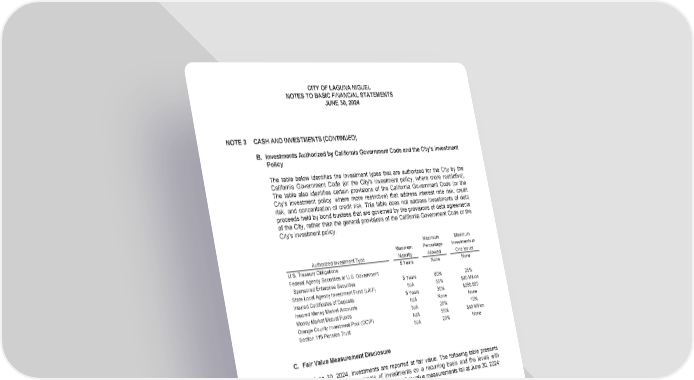 CITY OF LAGUNA NIGUEL NOTES TO BASIC FINANCIAL STATEMENTS JUNE 30, 2024 NOTE 3 CASH AND INVESTMENTS (CONTINUED) B. Investments Authorized by California Government Code and the City’s Investment Policy elow identifies the investment types that are authorized for the City by the The table b California Government Code (or the City's investment policy, where more restrictive). The table also identifies certain provisions of the California Government Code (or the City's investment policy, where more restrictive) that address interest rate risk, credit risk, and concentration of credit risk. This table does not address investments of debt proceeds he ld by bond trustees that are governed by the provisions of debt agreements nia Government Code or the of the City, rather than the general provisions of the Califor City's inve stment policy. Maximum Maximum Maximum Percentage Investments in Authorized Investment Type Maturity Allowed One Issuer U.S. Treasury Obligations 5 Years None None Federal Agency Securities or U.S. Government Sponsored Enterprise Securities 5 Years 60% 25% State Local Agency Investment Fund (LAIF) N/A 55% $40 Million Insured Certificates of Deposits 5 Years 30% $250,000 Insured Money Market Accounts N/A None None Money Market Mutual Funds N/A 20% 10% Orange County Investment Pool (OCIP) N/A 55% $40 Million Section 115 Pension Trust N/A 20% None C. Fair Value Measurement Disclosure At June 30, 2024, investments are reported at fair value. The following table presents e measurements of investments on a recurring basis and the levels with the fair valu GASB 72 fair value hierarchy in which the fair value measurements fall at June 30, 2024: Measurement Inputs Investment Type Level 1 Level 2 Uncategorized Total Federal Government Agency Securities $ - $ 34,514,486 $ - $ 34,514,486 U.S. Treasury Obligations 17,934,360 - - 17,934,360 Insured Certificates of Deposits - 4,472,993 4,472,993 Money Market Mutual Fund - 5,881,889 - 5,881,889 OCIP - - 78,121 78,121 PARS Pooled 115 Trust - - 2,179,843 2,179,843 LAIF - - 102,622 102,622 Total $ 17,934,360 $ 44,869,368 $ 2,360,586 $ 65,164,314 (51)