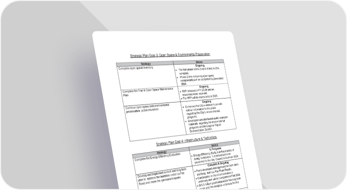 Strategic Plan Goal 3: Open Space & Environmental Preservation Strategy Status Complete open space inventory Ongoing x The first phase of this project (trails) is 25% complete. x Phase 2 (the remaining open space components) will be completed by December 2024. Complete the Trail & Open Space Maintenance Ongoing Plan x RFP released in FY 23-24 and no responses were received. x The RFP will be recirculated in 2025. Continue open space and environmental Ongoing preservation public education. x Enhanced the City’s website to provide critical information to the public regarding the City’s environmental programs. x Developed and distributed public outreach materials regarding the environmental programs and the Laguna Niguel Demonstration Garden. Strategic Plan Goal 4: Infrastructure & Technology Strategy Status Complete the Energy Efficiency Evaluation In Progress x Energy Efficiency Study is in the process of being completed. It is scheduled to be presented to the City Council in Summer 2024. Develop and implement a short and long-term Complete & Ongoing plan to address the landslide under La Paz x Plans developed and approved for both short Road and make the permanent repairs and long- term La Paz Road Repair. x Construction on the short term plan is underway and will be completed in Fall 2024. x $15.5 million grant obtained for the long term repair and the design is underway for that project. Continue implementation of the Total Cost of In Progress Ownership Program (City Infrastructure Analysis) x Parks inventory completed. x Facilities inventory will be completed in 2024. x Streets inventory will be completed in 2025. Begin the Active Transportation Study In Progress x Study is underway. x Community engagement and outreach is in process. x Study is expected to be completed in 2025. Complete the Crown Valley Park Outdoor WiFi Complete Project x Outdoor WiFi enhancement project is complete. x WiFi is now available for all visitors throughout Crown Valley Park. vi