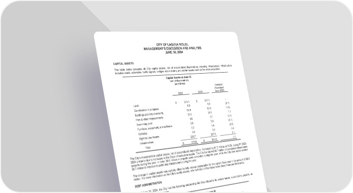 CITY OF LAGUNA NIGUEL MANAGEMENT’S DISCUSSION AND ANALYSIS JUNE 30, 2024 CAPITAL ASSETS The table below presents all City capital assets, net of accumulated depreciation, including infrastructure. Infrastructure includes roads, sidewalks, traffic signals, bridges, storm drains, and similar assets used by the entire population. Capital Assets at June 30 (net of depreciation) (in millions) Increase/ (Decrease) 2024 2023 from 2023 Land $ 271.1 $ 271.1 -. Construction in progress 6.8 6.9 (0.1) Buildings and improvements 60.4 62.0 (1.6) Park & other improvements 22.5 21.2 1.3 Swimming pool 1.6 1.7 (0.1) Furniture, equipment, and software 0.8 0.9 (0.1) Vehicles 0.2 0.4 (0.2) Right to Use Assets 0.6 0.2 0.4 Infrastructure 209.7 207.5 2.1 Total $ 573.6 $ 571.9 1.7 The City’s investment in capital assets, net of accumulated depreciation, increased by $1.7 million, or 0.3%, during FY 2023- 2024 primarily due to increases to the City’s infrastructure assets. The City transferred $6.7 million of completed infrastructure projects during the year. In total, $9.8 million in projects were completed during the year, while the City also added another $9.7 million to improve its parks and infrastructure during the year. The change in capital assets was partially offset by total annual depreciation for the current fiscal year in the amount of $8.6 million. For more information on the City’s capital assets, refer to Note 5 of the Notes to the Basic Financial Statements. DEBT ADMINISTRATION As of June 30, 2024, the City had the following outstanding liabilities related to its vehicle leases, subscriptions payable, as well as compensated absences: Long-Term Liabilities at June 30 (in millions) Increase/ (Decrease) 2024 2023 from 2023 Leases $ 0.2 $ 0.3 (0.1) Subscriptions Payable 0.2 - 0.2 Compensated Absences 0.6 0.6 - Total $ 1.0 $ 0.9 0.1 For more information on the City’s long-term liabilities, refer to Note 7 of the Notes to the Basic Financial Statements. (13)