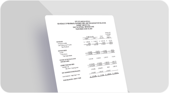 CITY OF LAGUNA NIGUEL SCHEDULE OF REVENUES, EXPENDITURES, AND CHANGES IN FUND BALANCES BUDGET AND ACTUAL GAS TAX SPECIAL REVENUE FUND YEAR ENDED JUNE 30, 2024 Variance with Final Budget Budget Amounts Actual Positive Original Final Amounts (Negative) REVENUES Intergovernmental $ 3,246,037 $ 3,246,037 $ 3,567,518 $ 321,481 Use of Money and Property 5,000 5,000 175,813 170,813 Total Revenues 3,251,037 3,251,037 3,743,331 492,294 EXPENDITURES Current: Public Works 1,230,450 1,230,450 1,147,800 82,650 Total Expenditures 1,230,450 1,230,450 1,147,800 82,650 EXCESS OF REVENUES OVER EXPENDITURES 2,020,587 2,020,587 2,595,531 574,944 OTHER FINANCING USES Transfers Out (2,132,909) (5,014,668) (2,560,490) 2,454,178 Total Other Financing Uses (2,132,909) (5,014,668) (2,560,490) 2,454,178 NET CHANGES IN FUND BALANCE (112,322) (2,994,081) 35,041 3,029,122 Fund Balances - Beginning of Year 3,165,407 3,165,407 3,165,407 - FUND BALANCES - END OF YEAR $ 3,053,085 $ 171,326 $ 3,200,448 $ 3,029,122 (87)