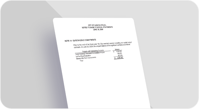 CITY OF LAGUNA NIGUEL NOTES TO BASIC FINANCIAL STATEMENTS JUNE 30, 2024 NOTE 14 OUTSTANDING COMMITMENTS Prior to the end of the fiscal year, the City awarded several consulting and capital project contracts. At June 30, 2024, the unspent balance of the significant contracts is as follows: Projects with Outstanding Contracts Balance Local Roadway Pavement Rehabilitation Project $ 1,045,989 La Paz Road Evaluation 824,451 Marina Hills Park Improvements 497,004 Total $ 2,367,444 (72)