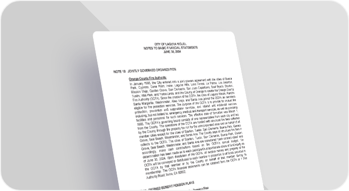 CITY OF LAGUNA NIGUEL NOTES TO BASIC FINANCIAL STATEMENTS JUNE 30, 2024 NOTE 10 JOINTLY GOVERNED ORGANIZATION Orange County Fire Authority In January 1995, the City entered into a joint powers agreement with the cities of Buena Park, Cypress, Dana Point, Irvine, Laguna Hills, Lake Forest, La Palma, Los Alamitos, Mission Viejo, Garden Grove, San Clemente, San Juan Capistrano, Seal Beach, Stanton, Tustin, Villa Park, and Yorba Linda, and the County of Orange to create the Orange County Fire Authority (OCFA). Since the creation of the OCFA, the cities of Laguna Woods, Rancho Santa Margarita, Westminster, Aliso Viejo, and Santa Ana joined the OCFA as members eligible for fire protection services. The purpose of the OCFA is to provide for mutual fire protection, prevention and suppression services, and related and incidental services including, but not limited to, emergency medical and transport services, as well as providing facilities and personnel for such services. The effective date of formation was March 1, 1995. The OCFA’s governing board consists of one representative from each city and two from the County. The operations of the OCFA are funded with structural fire fees collected by the County through the property tax roll for the unincorporated area and on behalf of all member cities except for the cities of Stanton, Tustin, San Clemente, Buena Park, Garden Grove, Seal Beach, Westminster, and Santa Ana. The County pays all structural fire fees it collects to the OCFA. The cities of Stanton, Tustin, San Clemente, Buena Park, Garden Grove, Seal Beach, Westminster, and Santa Ana are considered “cash contract cities” and accordingly, make cash contributions based on the OCFA’s annual budget. No determination has been made as to each participant’s proportionate share of fund equity as of June 30, 2024. Upon dissolution of the OCFA, all surplus money and property of the OCFA will be conveyed or distributed to each member in proportion to all funds provided to the OCFA by that member or by the County on behalf of that member during its membership. The OCFA financial statements can be obtained from the OCFA at 1 Fire Authority Road, Irvine, CA 92602. NOTE 11 DEFINED BENEFIT PENSION PLANS A. General Information about the Pension Plan Plan Description The City contributes to CalPERS, a cost-sharing, multiemployer defined pension plan, for its’ miscellaneous employees. CalPERS provides retirement and disability benefits, annual cost-of-living adjustments, and death benefits to plan members and beneficiaries. CalPERS acts as a common investment and administrative agent for participating public entities within the state of California. Benefit provisions and all other requirements are established by state statute and City ordinance. Copies of CalPERS’ annual financial report may be obtained from its website under Forms and Publications. (62)