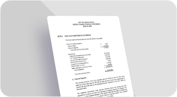 CITY OF LAGUNA NIGUEL NOTES TO BASIC FINANCIAL STATEMENTS JUNE 30, 2024 NOTE 3 CASH AND INVESTMENTS (CONTINUED) The City’s cash and investments at June 30, 2024 in more detail: Cash and Cash Equivalents: Cash on Hand $ 2,400 Demand Deposits 3,176,692 Total Cash and Cash Equivalents 3,179,092 Investments: Federal Government Agency Securities 34,514,486 U.S. Treasury Obligations 17,934,360 Insured Certificates of Deposits 4,472,993 Money Market Mutual Fund 5,881,889 Orange County Investment Pool 78,121 PARS Pooled 115 Trust 2,179,843 State Local Agency Investment Fund 102,622 Total Investments 65,164,314 Total Cash and Investments $ 68,343,406 A. Demand Deposits The carrying amounts of the City’s deposits were $3,176,692 at June 30, 2024. Bank balances at that date were $4,165,534, the total amount of which was collateralized or insured with accounts held by the pledging financial institutions in the City’s name as discussed below. The California Government Code requires California banks and savings and loan associations to secure the City’s cash deposits by pledging securities as collateral. This Code states that collateral pledged in this manner shall have the effect of perfecting a security interest in such collateral superior to those of a general creditor. Thus, collateral for cash deposits is considered to be held in the City’s name. The market value of pledged securities must equal at least 110% of the City’s cash deposits. California law also allows institutions to secure City deposits by pledging first trust deed mortgage notes having a value of 150% of the City’s total cash deposits. The City may waive collateral requirements for cash deposits, which are fully insured up to $250,000 by the Federal Deposit Insurance Corporation. The City, however, has not waived the collateralization requirements. The City follows the practice of pooling cash and investments of all funds, except for funds deposited in escrow which were required by construction projects. Interest income earned on pooled cash and investments is allocated on an accounting period basis to the various funds based on the period-end cash and investment balances. (50)