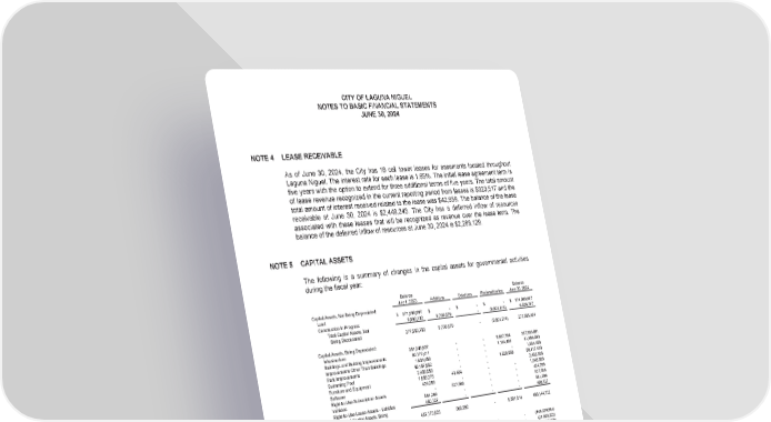 CITY OF LAGUNA NIGUEL NOTES TO BASIC FINANCIAL STATEMENTS JUNE 30, 2024 NOTE 4 LEASE RECEIVABLE As of June 30, 2024, the City has 16 cell tower leases for easements located throughout Laguna Niguel. The interest rate for each lease is 1.65%. The initial lease agreement term is five years with the option to extend for three additional terms of five years. The total amount of lease revenue recognized in the current reporting period from leases is $323,517 and the total amount of interest received related to the lease was $42,959. The balance of the lease receivable at June 30, 2024 is $2,449,243. The City has a deferred inflow of resources associated with these leases that will be recognized as revenue over the lease term. The balance of the deferred inflow of resources at June 30, 2024 is $2,288,129. NOTE 5 CAPITAL ASSETS The following is a summary of changes in the capital assets for governmental activities during the fiscal year: Balance Balance July 1, 2023 Additions Deletions Reclassification June 30, 2024 Capital Assets, Not Being Depreciated: Land $ 271,068,667 $ - $ - $ - $ 271,068,667 Construction In Pro gress 6,892,132 9,736,579 - 6,826,7(9,801,914) 97 Total Capital Assets, Not Being Depreciated 277,960,799 9,736,579 - 2(9,801,914) 77,895,464 Capital Assets, Being Depreciated: Infrastructure 351, 245,927 - - 6,687,764 357,933,691 Buildin gs and Building Improvements 80,772,411 - - 1,184,482 81,956,893 Improvements Other Than Buildings 1,904,458 - - 1,904,4- 58 Park Improvements 48,187,802 - - 1,929,668 50,117,470 Swimmin g Pool 2,408,558 - - 2,408,558 Furniture and Equipment 1,808,375 41,484 - - 1,849,859 Software 424,269 - - - 424,269 Ri ght-to-Use Subscription Assets 527,508- - 527,5- 08 Vehicles 561,299 - - - 561,299 Ri ght-to-Use Lease Assets - Vehicles 460,727 - - 460,7- 27 Total Capital Assets, Being Depreciated 487,773,826 568,992 9- 4,801,914 98,144,732 Less: Accumulated Depreciation: Infrastructure (143,685,499) (4,654,065) - - (148,339,564) Buildings and Building Improvements (18,805,456) (2,702,746) - - (21,508,202) Improvements Other Than Buildings (402,641) (124,428) - - (527,069) Park Improvements (28,443,214) (530,715) - - (28,973,929) Swimming Pool (736,859) (99,923) - - (836,782) Furniture And Equipment (1,001,851) (124,177) - - (1,126,028) Software (334,077) (42,427) - - (376,504) Right-to-Use Subscription Assets - -(105,500) - (105,500) Vehicles (217,657) -(108,934) - (326,591) Right-to-Use Lease Assets - Vehicles (190,205) -(85,729) - (275,934) Total Accumulated Depreciation (193,817,459) (8,578,644) - - (202,396,103) Total Capital Assets, Being Depreciated, Net 293,956,367 (8,009,652) 9- 2,801,914 95,748,629 Governmental Activities Capital Assets, Net $ 571,917,166 $ 1,726,927 $ - $ - $ 573,644,093 (55)
