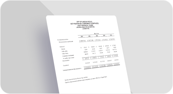 CITY OF LAGUNA NIGUEL NET POSITION BY COMPONENT (CONTINUED) LAST TEN FISCAL YEARS (ACCRUAL BASIS OF ACCOUNTING) (UNAUDITED) Fiscal Year 20202021202220232024 Governmental activities: Net investment in capital assets $ 588,977,831 $ 579,071,088 $ 572,776,211 $ 571,646,645 $ 570,027,950 Restricted: Pension $ 153,013 $ 692,039 $ 916,958 $ 2,004,472 $ 2,179,843 Public safety 72,830 84,2 85 34,327 48,977 89,845 Public Works 5,614,824 5,718,205 6,382,693 6,567,634 11,667,794 Community development 216,803 304,171 393,984 475 ,183 842 ,166 Air quality improvement - - - - - Total restricted $ 6,057,470 $ 6,798,700 $ 7,727,962 $ 9,096,266 $ 14,779,648 Unrestricted 32,595,299 35,742,243 38,117,655 43,8 26,907 44,674,514 Total governmental activities net position $ 627,630,600 $ 621,612,031 $ 618,621,828 $ 624,569,818 $ 629,482,112 The City does not have any Business-Type activities. Therefore, all governmental activities comprise the primary government of the City of Laguna Niguel. (99)