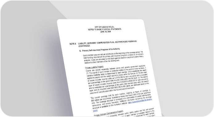CITY OF LAGUNA NIGUEL NOTES TO BASIC FINANCIAL STATEMENTS JUNE 30, 2024 NOTE 8 LIABILITY, WORKERS’ COMPENSATION PLAN, AND PURCHASED INSURANCE (CONTINUED) B. Primary Self-Insurance Programs of the Authority Each member pays an annual contribution at the beginning of the coverage period. The total funding requirement for primary self-insurance programs is based on an actuarial analysis. Costs are allocated to individual agencies based on payroll and claims history, relative to other members of the risk-sharing pool. Primary Liability Program Claims are pooled separately between police and general government exposures. (1) The payroll of each member is evaluated relative to the payroll of other members. A variable credibility factor is determined for each member, which establishes the weight applied to payroll and the weight applied to losses within the formula; (2) The first layer of losses includes incurred costs up to $100,000 for each occurrence and is evaluated as a percentage of the pool’s total incurred costs within the first layer; (3) The second layer of losses includes incurred costs from $100,000 to $500,000 for each occurrence and is evaluated as a percentage of the pool’s total incurred costs within the second layer; and (4) Incurred costs from $500,000 to $50 million, are distributed based on the outcome of cost allocation within the first and second loss layers. The overall coverage limit for each member, including all layers of coverage, is $50 million per occurrence. Subsidence losses also have a $50 million per occurrence limit. The coverage structure is composed of a combination of pooled self-insurance, reinsurance, and excess insurance. Additional information concerning the coverage structure is available on the Authority’s website: https://cjpia.org/coverage/risk-sharing- pools/. Primary Workers’ Compensation Program Claims are pooled separately between public safety (police and fire) and general government exposures. (1) The payroll of each member is evaluated relative to the payroll of other members. A variable credibility factor is determined for each member, which establishes the weight applied to payroll and the weight applied to losses within the formula; (2) The first layer of losses includes incurred costs up to $75,000 for each occurrence and is evaluated as a percentage of the pool’s total incurred costs within the first layer; (3) The second layer of losses includes incurred costs from $75,000 to $200,000 for each occurrence and is evaluated as a percentage of the pool’s total incurred costs within the second layer; and (4) Incurred costs from $200,000 to statutory limits are distributed based on the outcome of cost allocation within the first and second loss layers. (59)