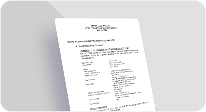 CITY OF LAGUNA NIGUEL NOTES TO BASIC FINANCIAL STATEMENTS JUNE 30, 2024 NOTE 12 OTHER POSTEMPLOYMENT BENEFITS (CONTINUED) B. Total OPEB Liability (Continued) Actuarial Methods and Assumption Used to Determined Total OPEB Liability The total OPEB liability was determined using the following actuarial methods and assumptions, applied to all periods included in the measurement period, unless otherwise specified: Contribution Policy No Pre-Funding Discount Rate 3.93% at June 30, 2024 (Bond Buyer 20-Bond Index) Inflation 2.50% Annually Mortality, Retirement, Disability, and Termination CalPERS 2000-2019 Experience Study Mortality Improvement Mortality Projected Fully Generational with Scale MP-2021 Salary Increases Aggregate - 2.75% Annually Merit - CalPERS 2000-2019 Experience Study Medical Trend Non-Medicare - 6.50% for 2023, Decreasing to an Ultimate Rate of 3.75% in 2076 Medicare - 5.65% for 2023, Decreasing to an Ultimate Rate of 3.75% in 2076 PEMHCA Minimum Increase 4.00% Annually Healthcare Participation at Retirement Actives - 50% Retirees - Current Election Spouse Coverage Actives: Current Election if Covered, 80% if Waived Retirees: Current Election Medicare Eligible 100% Change of Assumptions During the measurement period June 30, 2024, the accounting discount rate was updated based on the municipal bond rate. Discount Rate The discount rate used to measure the total OPEB liability was 3.93%. The discount rate is based on the yield or index rate for 20-year, tax-exempt general obligation municipal bonds with an average rating of AA/Aa or higher (or equivalent quality on another rating scale). (69)