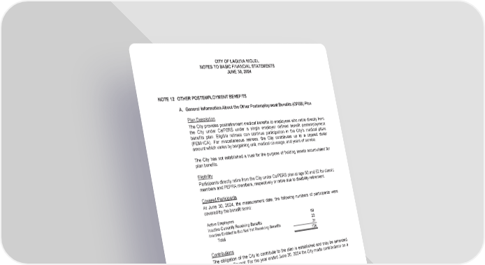 CITY OF LAGUNA NIGUEL NOTES TO BASIC FINANCIAL STATEMENTS JUNE 30, 2024 NOTE 12 OTHER POSTEMPLOYMENT BENEFITS A. General Information About the Other Postemployment Benefits (OPEB) Plan Plan Description The City provides postretirement medical benefits to employees who retire directly from the City under CalPERS under a single employer defined benefit postemployment benefits plan. Eligible retirees can continue participation in the City’s medical plans (PEMHCA). For miscellaneous retirees, the City contributes up to a capped dollar amount which varies by bargaining unit, medical coverage, and years of service. The City has not established a trust for the purpose of holding assets accumulated for plan benefits. Eligibility Participants directly retire from the City under CalPERS plan at age 50 and 52 for classic members and PEPRA members, respectively or retire due to disability retirement. Covered Participants At June 30, 2024, the measurement date, the following numbers of participants were covered by the benefit terms: Active Employees 80 Inactive Currently Receiving Benefits 23 Inactive Entitled to But Not Yet Receiving Benefits 31 Total 134 Contributions The obligation of the City to contribute to the plan is established and may be amended by the City Council. For the year ended June 30, 2024 the City made contributions on a pay-as-you-go basis. B. Total OPEB Liability measured as of June 30, 2024, and the total The City’s total OPEB liability was OPEB determined by an actuarial valuation as of June 30, 2022, rolled forward to liability was June 30, 2024, using standard updated proced ures. (68)