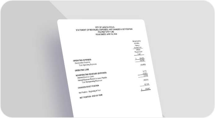 CITY OF LAGUNA NIGUEL STATEMENT OF REVENUES, EXPENSES, AND CHANGES IN NET POSITION PROPRIETARY FUND YEAR ENDED JUNE 30, 2024 Governmental Activities - Internal Service Fund Vehicle Replacement Fund OPERATING EXPENSES Depreciation Expense $ 194,663 Total Operating Expenses 194,663 OPERATING LOSS (194,663) NONOPERATING REVENUES (EXPENSES) Interest Revenue (Loss) 14,713 Interest Expense Related to Lease Payable (18,251) Total Nonoperating Revenues (3,538) CHANGES IN NET POSITION (198,201) Net Position - Beginning of Year 637,248 NET POSITION - END OF YEAR $ 439,047 See accompanying Notes to Basic Financial Statements. (33)