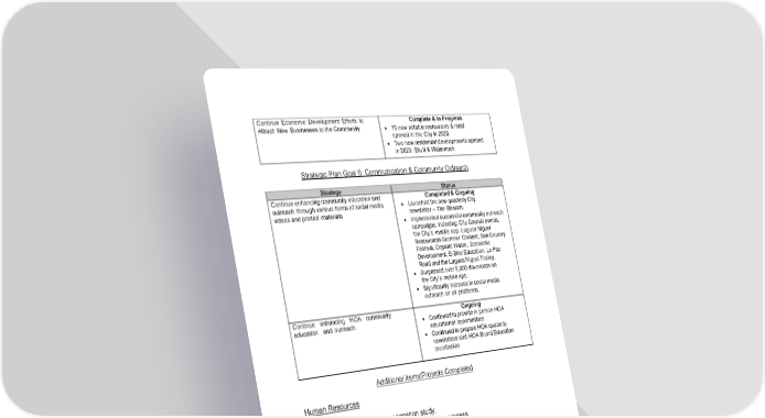 Continue Economic Development Efforts to Complete & In Progress Attract New Businesses to the Community x 15 new notable restaurants & retail opened in the City in 2023. x Two new residential developments opened in 2023: Blu II & Watermark Strategic Plan Goal 6: Communication & Community Outreach Strategy Status Continue enhancing community education and Completed & Ongoing outreach through various forms of social media, x Launched the new quarterly City videos and printed materials newsletter – The Beacon. x Implemented successful community outreach campaigns, including: City Council events, the City’s mobile app, Laguna Niguel Restaurants Summer Contest, Sea Country Festival, Organic Waste, Economic Development, E-Bike Education, La Paz Road and the Laguna Niguel Trolley. x Surpassed over 5,000 downloads on the City’s mobile app. x Significantly increase in social media outreach on all platforms. Continue enhancing HOA community Ongoing education and outreach x Continued to provide in person HOA educational opportunities. x Continued to prepare HOA quarterly newsletters and HOA Board Education roundtables. Additional Items/Projects Completed Human Resources x Completed compensation study. x Streamlined the employee new hire process. x Conducted numerous employee training programs. x Conducted numerous leadership, employee development and engagement trainings and programs throughout the year. Information Technology x Provided bi-annual staff training on ransomware, spyware & virtual threats. x Implemented a new backup system for all on-premises and cloud-based servers to protect the City from ransomware and other threats to City data. x Implemented Multi Factor Authentication for all City employees. viii