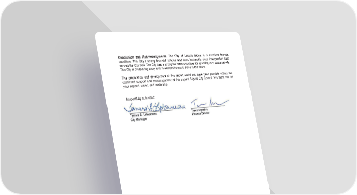 Conclusion and Acknowledgments. The City of Laguna Niguel is in excellent financial condition. The City’s strong financial policies and keen leadership since incorporation have served the City well. The City has a strong tax base and plans it’s spending very conservatively. The City is prospering today and is well positioned to thrive in the future. The preparation and development of this report would not have been possible without the continued support and encouragement of the Laguna Niguel City Council. We thank you for your support, vision, and leadership. Respectfully submitted: x