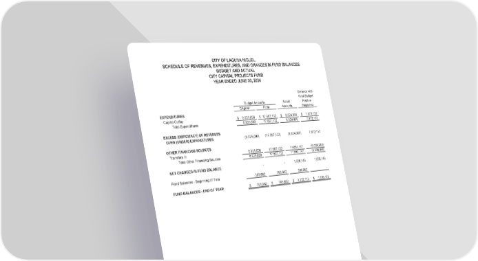 CITY OF LAGUNA NIGUEL SCHEDULE OF REVENUES, EXPENDITURES, AND CHANGES IN FUND BALANCES BUDGET AND ACTUAL CITY CAPITAL PROJECTS FUND YEAR ENDED JUNE 30, 2024 Variance with Final Budget Budget Amounts Actual Positive Original Final Amounts (Negative) EXPENDITURES Capital Outlay $ 6,925,000 $ 17,697,132 $ 9,824,999 $ 7,872,133 Total Expenditures 6,925,000 17,697,132 9,824,999 7,872,133 EXCESS (DEFICIENCY) OF REVENUES OVER (UNDER) EXPENDITURES (6,925,000) (17,697,132) (9,824,999) 7,872,133 OTHER FINANCING SOURCES Transfers In 6,925,000 17,697,132 11,661,147 (6,035,985) Total Other Financing Sources 6,925,000 17,697,132 11,661,147 (6,035,985) NET CHANGES IN FUND BALANCE - - 1,836,148 1,836,148 Fund Balances - Beginning of Year 395,962 395,962 395,962 - FUND BALANCES - END OF YEAR $ 395,962 $ 395,962 $ 2,232,110 $ 1,836,148 (93)