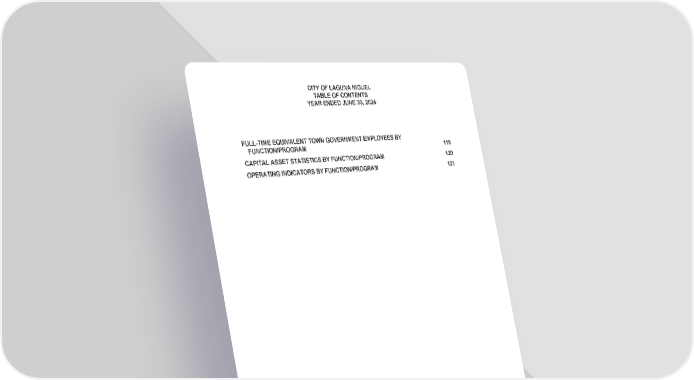 CITY OF LAGUNA NIGUEL TABLE OF CONTENTS YEAR ENDED JUNE 30, 2024 FULL-TIME EQUIVALENT TOWN GOVERNMENT EMPLOYEES BY FUNCTION/PROGRAM 118 CAPITAL ASSET STATISTICS BY FUNCTION/PROGRAM 120 OPERATING INDICATORS BY FUNCTION/PROGRAM 121