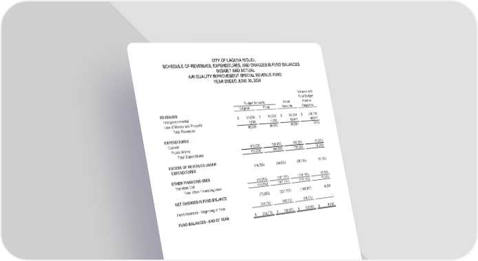 CITY OF LAGUNA NIGUEL SCHEDULE OF REVENUES, EXPENDITURES, AND CHANGES IN FUND BALANCES BUDGET AND ACTUAL AIR QUALITY IMPROVEMENT SPECIAL REVENUE FUND YEAR ENDED JUNE 30, 2024 Variance with Final Budget Budget Amounts Actual Positive Original Final Amounts (Negative) REVENUES Intergovernmental $ 85,000 $ 85,000 $ 65,264 $ (19,736) Use of Money and Property 1,000 1,000 19,817 18,817 Total Revenues 86,000 86,000 85,081 (919) EXPENDITURES Current: Public Works 100,000 100,000 105,280 (5,280) Total Expenditures 100,000 100,000 105,280 (5,280) EXCESS OF REVENUES UNDER EXPENDITURES (14,000) (14,000) (20,199) (6,199) OTHER FINANCING USES Transfers Out (59,953) (187,757) (175,168) 12,589 Total Other Financing Uses (59,953) (187,757) (175,168) 12,589 NET CHANGES IN FUND BALANCE (73,953) (201,757) (195,367) 6,390 Fund Balances - Beginning of Year 308,732 308,732 308,732 - FUND BALANCES - END OF YEAR $ 234,779 $ 106,975 $ 113,365 $ 6,390 (89)