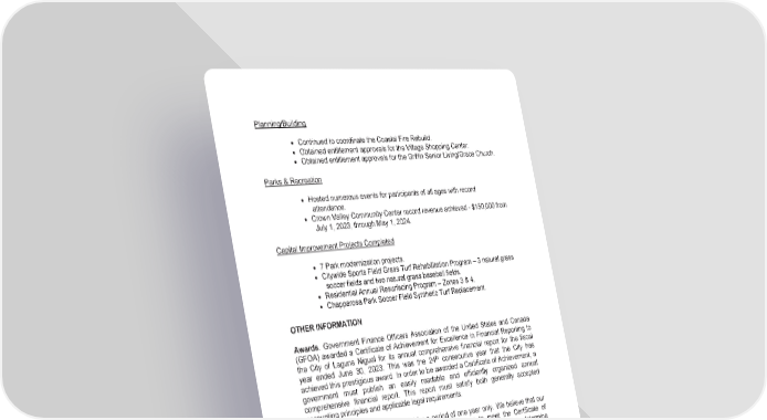 Planning/Building x Continued to coordinate the Coastal Fire Rebuild. x Obtained entitlement approvals for the Village Shopping Center. x Obtained entitlement approvals for the Griffin Senior Living/Grace Church. Parks & Recreation x Hosted numerous events for participants of all ages with record attendance. x Crown Valley Community Center record revenue achieved - $150,000 from July 1, 2023, through May 1, 2024. Capital Improvement Projects Completed x 7 Park modernization projects. x Citywide Sports Field Grass Turf Rehabilitation Program – 3 natural grass soccer fields and two natural grass baseball fields. x Residential Annual Resurfacing Program – Zones 3 & 4. x Chapparosa Park Soccer Field Synthetic Turf Replacement. OTHER INFORMATION Awards. Government Finance Officers Association of the United States and Canada (GFOA) awarded a Certificate of Achievement for Excellence in Financial Reporting to the City of Laguna Niguel for its annual comprehensive financial report for the fiscal th year ended June 30, 2023. This was the 24 consecutive year that the City has achieved this prestigious award. In order to be awarded a Certificate of Achievement, a government must publish an easily readable and efficiently organized annual comprehensive financial report. This report must satisfy both generally accepted accounting principles and applicable legal requirements. A Certificate of Achievement is valid for a period of one year only. We believe that our current annual comprehensive financial report continues to meet the Certificate of Achievement Program’s requirements, and we are submitting it to GFOA to determine its eligibility for another certificate. ix