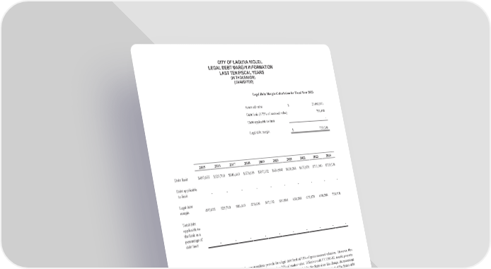 CITY OF LAGUNA NIGUEL LEGAL DEBT MARGIN INFORMATION LAST TEN FISCAL YEARS (IN THOUSANDS) (UNAUDITED) Legal Debt Margin Calculation for Fiscal Year 2023 Assessed value $ 20,082,871 Debt limit (3.75% of assessed value) 753,108 Debt applicable to limit - Legal debt margin $ 753,108 2015 2016 2017 2018 2019 2020 2021 2022 2023 2024 Debt limit $ 52497,655 $ 5465,703 $ 57,443 $ 5973,609 $ 63,132 $ 654,984 $ 68,288 $ 7175,878 $ 7531,940 $ ,108 Debt applicable to limit - - - - - - - - - - Legal debt margin 497,655 525,703 546 ,443 573,609 597 ,132 634,984 65 8,288 675,878 658,288 753 ,108 Total debt applicable to the limit as a percentage of debt limit - - - - - - - - - - Note: Thegeneral laws of the State of California for municipalities provide for a legal debt limit of 15% of gross assessed valuation. However, this provision was enacted when assessed valuation was established based on 25% of market value. Effective with FY1981-82, taxable property is assessed at 100% of market value. Although the debt limit provision has not been amended by the State since this change, the percentage has been proportionately modified to 3.75% for the purpose of this calculation for the consistency with the original intent of the State's debt limit. (114)