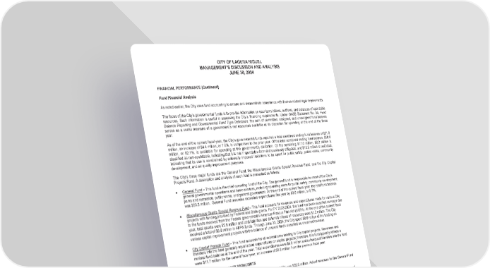 CITY OF LAGUNA NIGUEL MANAGEMENT’S DISCUSSION AND ANALYSIS JUNE 30, 2024 FINANCIAL PERFORMANCE (Continued) Fund Financial Analysis As noted earlier, the City uses fund accounting to ensure and demonstrate compliance with finance-related legal requirements. The focus of the City’s governmental funds is to provide information on near-term inflows, outflows, and balances of spendable resources. Such information is useful in assessing the City’s financing requirements. Under GASB Statement No. 54, Fund Balance Reporting and Governmental Fund Type Definitions, the sum of committed, assigned, and unassigned fund balance serves as a useful measure of a government’s net resources available at its discretion for spending at the end of the fiscal year. As of the end of the current fiscal year, the City’s governmental funds reported a total combined ending fund balance of $61.6 million, an increase of $4.4 million, or 7.8%, in comparison to the prior year. Of the total combined ending fund balance, $50.6 million, or 82.1%, is available for spending at the government’s discretion. Of the remaining $11.0 million, $0.2 million is classified as non-spendable, indicating that it is not in spendable form and previously obligated, and $10.8 million is restricted, indicating that its use is constrained by externally imposed limitations to be spent for public safety, public works, community development, and air quality improvement purposes. The City’s three major funds are the General Fund, the Miscellaneous Grants Special Revenue Fund, and the City Capital Projects Fund. A description and analysis of each fund is presented as follows: x General Fund – This fund is the chief operating fund of the City. The general fund is responsible for most of the City’s general governmental operations and basic services, including operating costs for public safety, community development, parks and recreation, public works, and general government. At the end of the current fiscal year, the total fund balance was $53.3 million. General Fund revenues exceeded expenditures this year by $3.0 million, or 5.7%. x Miscellaneous Grants Special Revenue Fund – This fund accounts for revenues and expenditures made for various City projects with funding provided by Federal and State grants. For FY 2023-2024, this fund has been classified as major due to the funds received from the Federal government’s American Rescue Plan Act (ARPA). At the end of the current fiscal year, total assets were $0.9 million and total liabilities and deferred inflows of resources were $1.2 million. The City received a total of $8.8 million in ARPA funds. Through June 30, 2024, the City spent $8.0 million of the funding on various capital improvement projects with the balance of unspent funds classified as unearned revenue. x City Capital Projects Fund – This fund accounts for all expenditures relating to City capital projects. Revenues and transfers into the fund generally equal actual expenditures on capital projects; therefore, this fund typically reflects a minimal fund balance at the end of the year. Total expenditures were $9.8 million and subsequent transfers into the fund were $11.7 million for the current fiscal year, an increase of $3.9 million from the previous fiscal year. GENERAL FUND BUDGETARY HIGHLIGHTS The original adopted General Fund revenue budget for FY 2023-2024 was $52.6 million. Actual revenues for the General Fund totaled $55.7 million, a positive variance of $3.1 million, or 5.9%. The primary reasons for this variance were higher property taxes ($1.6 million), investment income ($1.2 million), licenses and permits ($0.7 million), which all came in stronger than budgeted. The City intentionally budgets conservatively. The original adopted General Fund expenditure budget for fiscal year 2023-2024 was $51.9 million. Actual expenditures came in at $49.2 million, a positive variance of $2.7 million. The variance was due to actions the City took to continuously monitor and evaluate many operational budget items for effectiveness and efficiency. The General Fund ended with a positive, operational surplus of $3.0 million (actual revenues vs. actual non-capital expenditures). (12)