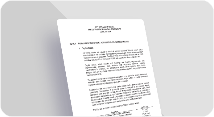 CITY OF LAGUNA NIGUEL NOTES TO BASIC FINANCIAL STATEMENTS JUNE 30, 2024 NOTE 1 SUMMARY OF SIGNIFICANT ACCOUNTING POLICIES (CONTINUED) I. Capital Assets al assets are valued at historical cost or estimated historical cost if actu All capit al l cost is not available. Contributed capital assets are valued at their acquisition historica value on the date of acquisition. The City’s policy is to capitalize all assets with an initial, individual cost equal to or more than $5,000 with a useful life of more than one year. Capital assets, which include land, buildings and building improvements, park improvements, swimming pool, furniture and equipment, software, vehicles, constructions in progress, and infrastructure assets (street systems, storm drains, bridges, etc. ), are reported in the governmental activities column of the government-wide ements. financial stat The costs of or normal maintenance and repairs that do not add to the value of the asset materially e xtend assets lives are not capitalized. Major outlays for capital assets and improvements are capitalized as projects are constructed. Depreciation has been provided on capital assets in the government-wide financial statements. Depreciation of all capital assets is charged as an expense against operations each year and the total amount of depreciation taken over the years, called accumulated depreciation, is reported on the Statement of Net Position as a reduction in the book value of capital assets. Depreciation is reported using the straight-line method, which means the cost of the asset is divided by its expected useful life in years and the charged to expense each year until the asset is fully depreciated. result is The City has assigned the useful lives listed below to capital assets: Asset Type Useful Lives Curbs, Gutters, Sidewalks, Catch Basins, and Manholes 100 Years Streets, Street Lights, Storm Drains, Tunnels, and Bridges 75 Years Buildings and Building Improvements 15 to 45 Years Swimming Pool and Improvements 15 to 25 Years Park Improvements 10 to 25 Years Furniture and Equipment 3 to 15 Years Vehicles 3 to 10 Years Software 10 Years Right-to-Use Lease Assets The Estimated Life of the Lease Asset or the Contract Term, Whichever is Shorte r (43)