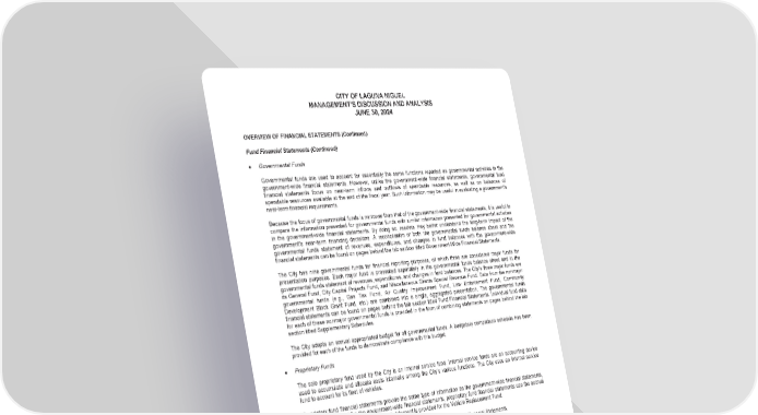 CITY OF LAGUNA NIGUEL MANAGEMENT’S DISCUSSION AND ANALYSIS JUNE 30, 2024 OVERVIEW OF FINANCIAL STATEMENTS (Continued) Fund Financial Statements (Continued) x Governmental Funds Governmental funds are used to account for essentially the same functions reported as governmental activities in the government-wide financial statements. However, unlike the government-wide financial statements, governmental fund financial statements focus on near-term inflows and outflows of spendable resources, as well as on balances of spendable resources available at the end of the fiscal year. Such information may be useful in evaluating a government’s near-term financial requirements. Because the focus of governmental funds is narrower than that of the government-wide financial statements, it is useful to compare the information presented for governmental funds with similar information presented for governmental activities in the government-wide financial statements. By doing so, readers may better understand the long-term impact of the government’s near-term financing decisions. A reconciliation of both the governmental funds balance sheet and the governmental funds statement of revenues, expenditures, and changes in fund balances with the government-wide financial statements can be found on pages behind the tab section titled Government-Wide Financial Statements. The City has nine governmental funds for financial reporting purposes, of which three are considered major funds for presentation purposes. Each major fund is presented separately in the governmental funds balance sheet and in the governmental funds statement of revenues, expenditures, and changes in fund balances. The City’s three major funds are its General Fund, City Capital Projects Fund, and Miscellaneous Grants Special Revenue Fund. Data from the nonmajor governmental funds (e.g., Gas Tax Fund, Air Quality Improvement Fund, Law Enforcement Fund, Community Development Block Grant Fund, etc.) are combined into a single, aggregated presentation. The governmental funds financial statements can be found on pages behind the tab section titled Fund Financial Statements. Individual fund data for each of these nonmajor governmental funds is provided in the form of combining statements on pages behind the tab section titled Supplementary Schedules. The City adopts an annual appropriated budget for all governmental funds. A budgetary comparison schedule has been provided for each of the funds to demonstrate compliance with this budget. x Proprietary Funds The sole proprietary fund used by the City is an internal service fund. Internal service funds are an accounting device used to accumulate and allocate costs internally among the City’s various functions. The City uses an internal service fund to account for its fleet of vehicles. Proprietary fund financial statements provide the same type of information as the government-wide financial statements, only in more detail. Like the government-wide financial statements, proprietary fund financial statements use the accrual basis of accounting. A separate financial statement is provided for the Vehicle Replacement Fund. The fund financial statements can be found behind the tab section titled Fund Financial Statements. Notes to the Basic Financial Statements The notes provide additional information that is essential to obtain a full understanding of the data provided in the government- wide and fund financial statements. The notes to the basic financial statements can be found behind the tab section titled Notes to the Basic Financial Statements. Required Supplementary Information Required supplementary information includes budgetary information on the General Fund, Miscellaneous Grants Special Revenue Fund, the budget process, the City’s share of net pension liability and related ratios, the schedule of pension contributions and schedule of changes in net OPEB liability and related ratios. Required supplementary information can be found behind the tab section titled Required Supplementary Information. (6)
