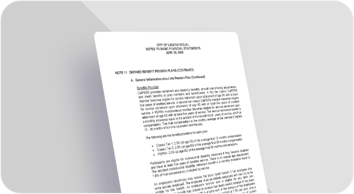 CITY OF LAGUNA NIGUEL NOTES TO BASIC FINANCIAL STATEMENTS JUNE 30, 2024 NOTE 11 DEFINED BENEFIT PENSION PLANS (CONTINUED) A. General Information about the Pension Plan (Continued) Benefits Provided CalPERS provides retirement and disability benefits, annual cost-of-living adjustments, and death benefits to plan members and beneficiaries. A first tier classic CalPERS member becomes eligible for service retirement upon attainment of age 55 with at least five years of credited service. A second tier classic CalPERS member becomes eligible for service retirement upon attainment of age 60 with at least five years of credited service. A PEPRA miscellaneous member becomes eligible for service retirement upon attainment of age 62 with at least five years of service. The service retirement benefit is a monthly allowance equal to the product of the benefit factor, years of service, and final compensation. The final compensation is the monthly average of the member’s highest 12 - 36 months of full-time equivalent monthly pay. The following are the benefit provisions for each plan: x Classic Tier 1: 2.0% (at age 55) of the average final 12 months compensation. x Classic Tier 2: 2.0% (at age 60) of the average final 36 months compensation. x PEPRA: 2.0% (at age 62) of the average final 36 months compensation. Participants are eligible for nonindustrial disability retirement if they become disabled and have at least five years of credited service. There is no special age requirement. The standard nonindustrial disability retirement benefit is a monthly allowance equal to 1.8% of final compensation, multiplied by service. An employee's beneficiary may receive the basic death benefit if the employee dies while actively employed. The employee must be actively employed with the City to be eligible for this benefit. An employee's survivor who is eligible for any other pre- retirement death benefit may choose to receive that death benefit instead of this basic death benefit. The basic death benefit is a lump sum in the amount of the employee's accumulated contributions, where interest is currently credited at 7.5% per year, plus a lump-sum in the amount of one month's salary for each completed year of current service, up to a maximum of six months' salary. For purposes of this benefit, one month's salary is defined as the member's average monthly full-time rate of compensation during the 12 months preceding death. Upon the death of a retiree, a one- time lump-sum payment of $500 will be made to the retiree’s designated survivor(s) or to the retiree’s estate. Benefit terms provide for annual cost-of-living adjustments to each employee’s retirement allowance. Beginning the second calendar year after the year of retirement, retirement and survivor allowances will be annually adjusted on a compound basis by 2.0%. (63)