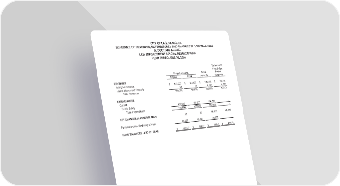CITY OF LAGUNA NIGUEL SCHEDULE OF REVENUES, EXPENDITURES, AND CHANGES IN FUND BALANCES BUDGET AND ACTUAL LAW ENFORCEMENT SPECIAL REVENUE FUND YEAR ENDED JUNE 30, 2024 Variance with Final Budget Budget Amounts Actual Positive Original Final Amounts (Negative) REVENUES Intergovernmental $ 150,000 $ 150,000 $ 186,758 $ 36,758 Use of Money and Property 50 50 4,110 4,060 Total Revenues 150,050 150,050 190,868 40,818 EXPENDITURES Current: Public Safety 150,000 150,000 150,000 - Total Expenditures 150,000 150,000 150,000 - NET CHANGES IN FUND BALANCE 50 50 40,868 40,818 Fund Balances - Beginning of Year 48,977 48,977 48,977 - FUND BALANCES - END OF YEAR $ 49,027 $ 49,027 $ 89,845 $ 40,818 (90)