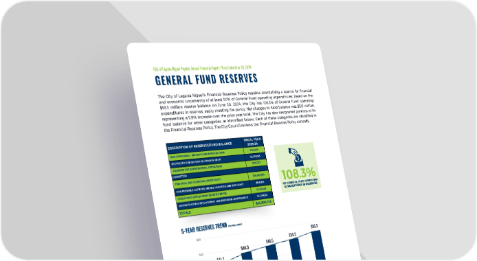 City of Laguna Niguel Popular Annual Financial Report | Year Ended June 30, 2024 GENERAL FUND RESERVES The City of Laguna Niguel’s Financial Reserves Policy requires maintaining a reserve for financial and economic uncertainty of at least 50% of General Fund operating expenditures. Based on the $53.3 million reserve balance on June 30, 2024, the City has 108.3% of General Fund operating expenditures in reserves, easily meeting the policy. Net changes to fund balance was $3.0 million, representing a 5.9% increase over the prior year total. The City has also designated portions of its fund balance for other categories, as identified below. Each of these categories are identified in the Financial Reserves Policy. The City Council reviews the Financial Reserves Policy annually. FISCAL YEAR DESCRIPTION OF RESERVES/FUND BALANCE 2023-24 NON-SPENDABLE - DEPOSITS AND PREPAID ITEMS $173,938 RESTRICTED FOR SECTION 115 PENSION TRUST $2,179,843 ASSIGNED FOR DEPARTMENTAL OPERATIONS $222,223 COMMITTED: FINANCIAL AND ECONOMIC UNCERTAINTY $26,289,809 108.3% COMPENSABLE ACCRUED UNUSED VACATION AND SICK LEAVE $148,916 OF GENERAL FUND OPERATING OTHER POST-EMPLOYMENT BENEFITS (OPEB) $1,154,625 EXPENDITURES IN RESERVES INFRASTRUCTURE REPLACEMENT AND DEFERRED MAINTENANCE $23,139,352 TOTALS $53,308,706 5-YEAR RESERVES TREND (IN MILLIONS) $53.3 $50.3 $48.5 $46.3 $41.7 Non-spendable - Deposits and Prepaid Items Assigned for Departmental Operations Restricted for Section 115 Pension Trust Compensable Accrued Unused Vacation and Sick Leave Financial and Economic Uncertainty Other Post-Employment Benefits (OPEB) Infrastructure Replacement and Deferred Maintenance General Reserves Totals cityoflagunaniguel.org 12