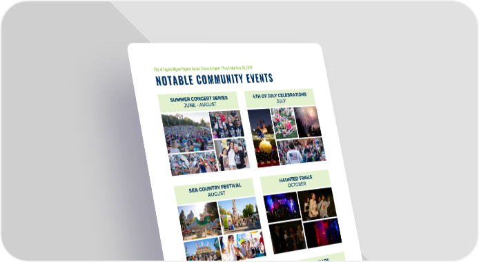 City of Laguna Niguel Popular Annual Financial Report | Year Ended June 30, 2024 NOTABLE COMMUNITY EVENTS SUMMER CONCERT SERIES 4TH OF JULY CELEBRATIONS JUNE - AUGUST JULY SEA COUNTRY FESTIVAL HAUNTED TRAILS AUGUST OCTOBER VETERANS DAY CEREMONY HOLIDAY PARADE NOVEMBER DECEMBER cityoflagunaniguel.org 06