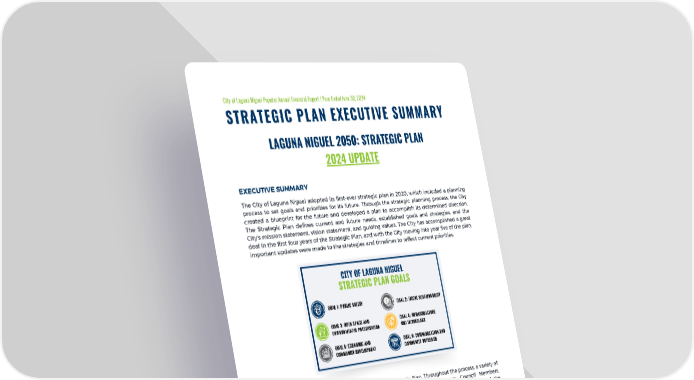 City of Laguna Niguel Popular Annual Financial Report | Year Ended June 30, 2024 STRATEGIC PLAN EXECUTIVE SUMMARY LAGUNA NIGUEL 2050: STRATEGIC PLAN 2024 UPDATE EXECUTIVE SUMMARY The City of Laguna Niguel adopted its first-ever strategic plan in 2020, which included a planning process to set goals and priorities for its future. Through the strategic planning process, the City created a blueprint for the future and developed a plan to accomplish its determined direction. The Strategic Plan defines current and future needs, established goals and strategies, and the City's mission statement, vision statement, and guiding values. The City has accomplished a great deal in the first four years of the Strategic Plan, and with the City moving into year five of the plan, important updates were made to the strategies and timelines to reflect current priorities. CITY OF LAGUNA NIGUEL STRATEGIC PLAN GOALS GOAL 1: PUBLIC SAFETY GOAL 2: FISCAL SUSTAINABILITY GOAL 3: OPEN SPACE AND GOAL 4: INFRASTRUCTURE ENVIRONMENTAL PRESERVATION AND TECHNOLOGY GOAL 5: ECONOMIC AND GOAL 6: COMMUNICATION AND COMMUNITY DEVELOPMENT COMMUNITY OUTREACH A collaborative process was used to update the Strategic Plan. Throughout the process, a variety of stakeholders were involved, including City residents, business owners, Council Members, commissioners, committee members, department heads, and staff. The process included the preparation of an environmental scan, a strategic plan survey, and a workshop to discuss the City's goals for the future. The City's continued success in implementing the identified priorities outlined in the Strategic Plan has furthered the achievement of the goals established by the City Council. This 2024 Strategic Plan Update reflects new and modified strategies and timelines to ensure those goals are achieved. The 2024 Laguna Niguel Strategic Plan contains the following elements: Organizational mission, vision, and values. Six goals Strategies for each goal Implementation action plan cityoflagunaniguel.org 07