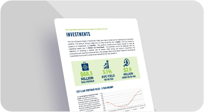 City of Laguna Niguel Popular Annual Financial Report | Year Ended June 30, 2024 INVESTMENTS The City of Laguna Niguel’s Investment Policy provides a framework for managing its investment portfolio. The policy’s primary objectives, in order of priority, are: 1) Safety - the City intends to preserve its investment; 2) Liquidity - the portfolio should remain liquid enough to meet all operating needs; and 3) Return on Investment - the portfolio should be designed with the objective of attaining a market rate of return, while taking into account investment risk constraints and cash flow characteristics. The average return of the State Treasurer's Local Agency Investment Fund (LAIF) is used as benchmark for the City's portfolio. $68.3 3.1% $2.9 AVG YIELD MILLION MILLION TOTAL PORTFOLIO FOR THE YEAR EARNED FOR THE YEAR CITY & LAIF PORTFOLIO YIELDS - 5 YEAR HISTORY The Local Agency Investment Fund (LAIF), managed by the State Treasurer, serves as an alternative investment pool for public agencies. The LAIF yield is used as benchmark for the City's portfolio. The graph on the right compares the City’s portfolio yields with the LAIF portfolio yields over the past five years. City LAIF PORTFOLIO DIVERSIFICATION 5-YEAR PORTFOLIO SIZE TREND (IN MILLIONS) $68.3 $67.1 $65.7 $59.3 $51.3 Agency Securities 52% US Treasuries 26% Certificate of Deposits 7% Money Market 15% cityoflagunaniguel.org 14