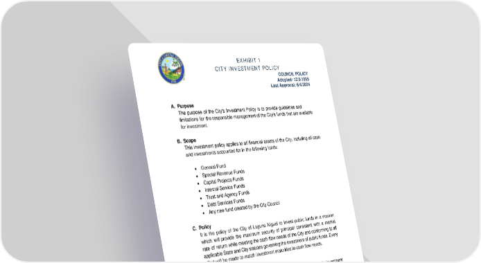 EXHIBIT 1 CITY INVESTMENT POLICY COUNCIL POLICY Adopted: 12/5/1995 Last Approval: 6/4/2024 A. Purpose The purpose of the City's Investment Policy is to provide guidelines and limitations for the responsible management of the City's funds that are available for investment. B. Scope This investment policy applies to all financial assets of the City, including all cash and investments accounted for in the following funds: • General Fund • Special Revenue Funds • Capital Projects Funds • Internal Service Funds • Trust and Agency Funds • Debt Services Funds • Any new fund created by the City Council C. Policy It is the policy of the City of Laguna Niguel to invest public funds in a manner which will provide the maximum security of principal consistent with a market rate of return while meeting the cash flow needs of the City and conforming to all applicable State and City statutes governing the investment of public funds. Every effort will be made to match investment maturities to cash flow needs. D. Objectives The primary objectives, in priority order, of the City of Laguna Niguel’s investment activities shall be: 1. Safety: Safety of principal is the foremost objective of the City. Investments of the City shall be undertaken in a manner that seeks to ensure the preservation of the capital in the overall portfolio. 2. Liquidity: The City’s investment portfolio will remain sufficiently liquid to enable the City to meet all operating requirements which might be reasonably anticipated. 1 of 8 127
