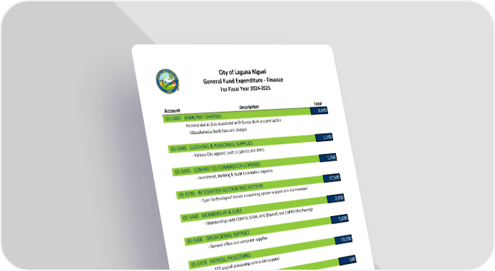 City of Laguna Niguel General Fund Expenditure ‐ Finance For Fiscal Year 2024‐2025 Account Description Total 05‐5007 BANK/NSF CHARGES 8,400 Increase due to fees associated with Sweep Bank account option ‐ Miscellaneous bank fees and charges 05‐5040 CLOTHING & PERSONNEL SUPPLIES 1,500 ‐ Various City apparel, such as jackets and shirts 05‐5045 COMMITTEE/COMMISSION STIPENDS 1,000 ‐ Investment, Banking & Audit Committee stipends 05‐5230 INTEGRATED ACCOUNTING SYSTEMS 57,900 ‐ Tyler Technologies' Incode accounting system support and maintenance 05‐5440 MEMBERSHIP & DUES 2,000 ‐ Memberships with CSMFO, GFOA, APA (Payroll) and CAPPO (Purchasing) 05‐5460 OPERATIONAL SUPPLIES 5,000 ‐ General office and computer supplies 05‐5470 PAYROLL PROCESSING 73,500 ‐ ADP payroll processing service and support 05‐5500 PRINTING & MAILING 500 ‐ Printing and mailing of Finance‐related documents 05‐5640 RESOURCE MATERIALS 5,500 ‐ Bauer Financial bank rating and monitoring reports, reports related to preparing the Annual Comprehensive Financial Report, publications, updates 05‐5645 SAFEKEEPING SERVICES 11,500 ‐ Quarterly brokerage fee for US Bank's safekeeping service 05‐5720 TRAVEL, MEETINGS & CONFERENCES 4,000 ‐ California Society of Municipal Finance Officers annual conference, Governmental Finance Officers Association workshops, other prof. development 41
