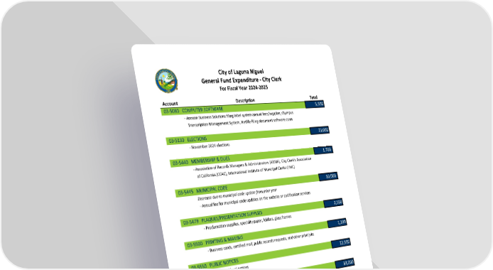 City of Laguna Niguel General Fund Expenditure ‐ City Clerk For Fiscal Year 2024‐2025 Account Description Total 03‐5080 COMPUTER SOFTWARE 5,500 ‐ Annson Business Solutions filing label system annual fees/supplies, Olympus Transcription Management System, Netfile filing document software costs 03‐5130 ELECTIONS 73,000 ‐ November 2024 elections 03‐5440 MEMBERSHIP & DUES 1,700 ‐ Association of Records Managers & Administrators (ARMA), City Clerk's Association of California (CCAC), International Institute of Municipal Clerks (IIMC) 03‐5445 MUNICIPAL CODE 10,000 Decrease due to municipal code update from prior year ‐ Annual fee for municipal code updates on the website or codification services 03‐5479 PLAQUES/PRESENTATION SUPPLIES 2,500 ‐ Proclamation supplies, specialty paper, folders, glass frames 03‐5500 PRINTING & MAILING 1,200 ‐ Business cards, certified mail, public records requests, and other print jobs 03‐5550 PUBLIC NOTICES 22,500 ‐ Printing of legal notices 03‐5580 RECORDS MANAGEMENT 83,000 ‐ Outsourcing of scanning services for document imaging, off‐site electronic storage, documents storage with Iron Mountain, annual costs for Laserfiche 03‐5640 RESOURCE MATERIALS 500 ‐ Subscriptions to local online newspapers for research, online legal resources 03‐5720 TRAINING, MEETINGS & CONFERENCES 6,800 ‐ City Clerk's Association of California conference, New Law and Election seminar 03‐6450 LEGAL SERVICES 31,500 ‐ Legal services for review of comprehensive Municipal Code update 32