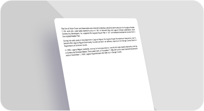 The firm of Victor Gruen and Associates was retained to develop a detailed community plan for the approximately 7,100- acre site. Land sales started to occur in 1961 in Monarch Bay and Laguna Terrace subdivisions. Avco Community Developers, Inc. acquired the Laguna Niguel Plan in 1971 and initiated development as set forth in the original Master Plan. During the early years of development in Laguna Niguel, the Laguna Niguel Homeowners Association, later to become the Laguna Niguel Community Council, served in an advisory capacity to the Orange County Board of Supervisors on land use issues. In 1986, Laguna Niguel residents, looking for local governance, took the first step toward cityhood by forming a Community Services District. Three years later, on November 7, 1989, 89% of the voters favored incorporation and on December 1, 1989, Laguna Niguel became the 29th city in Orange County. 2