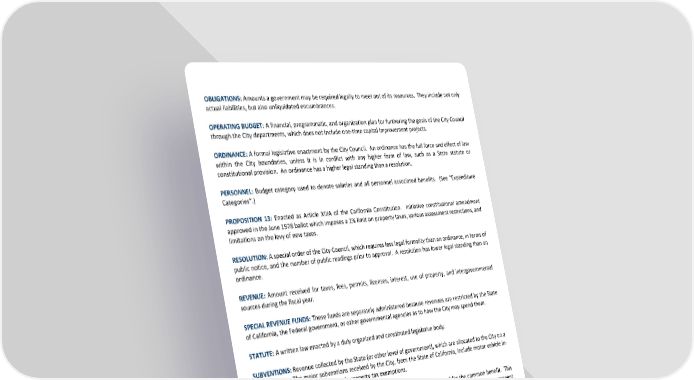 OBLIGATIONS: Amounts a government may be required legally to meet out of its resources. They include not only actual liabilities, but also unliquidated encumbrances. OPERATING BUDGET: A financial, programmatic, and organization plan for furthering the goals of the City Council through the City departments, which does not include one-time capital improvement projects. ORDINANCE: A formal legislative enactment by the City Council. An ordinance has the full force and effect of law within the City boundaries, unless it is in conflict with any higher form of law, such as a State statute or constitutional provision. An ordinance has a higher legal standing than a resolution. PERSONNEL: Budget category used to denote salaries and all personnel associated benefits. (See “Expenditure Categories”.) PROPOSITION 13: Enacted as Article XIIIA of the California Constitution. Initiative constitutional amendment approved in the June 1978 ballot which imposes a 1% limit on property taxes, various assessment restrictions, and limitations on the levy of new taxes. RESOLUTION: A special order of the City Council, which requires less legal formality than an ordinance, in terms of public notice, and the number of public readings prior to approval. A resolution has lower legal standing than an ordinance. REVENUE: Amount received for taxes, fees, permits, licenses, interest, use of property, and intergovernmental sources during the fiscal year. SPECIAL REVENUE FUNDS: These funds are separately administered because revenues are restricted by the State of California, the Federal government, or other governmental agencies as to how the City may spend them. STATUTE: A written law enacted by a duly organized and constituted legislative body. SUBVENTIONS: Revenue collected by the State (or other level of government), which are allocated to the City on a formula basis. The major subventions received by the City, from the State of California, include motor vehicle in- lieu, gasoline taxes, and homeowner’s property tax exemptions. TAXES: Compulsory charges levied by a government to finance services performed for the common benefit. This term does not include specific charges made against particular persons or property for current or permanent benefits, such as special assessments. Neither does the term include charges for services rendered only to those paying such charges (e.g., Senior Center class registration fees). TRANSIENT OCCUPANCY TAX: A tax levied on lodging rentals (e.g., hotels, motels) where occupancy is less than 30 days and paid by the lodger. USE OF MONEY AND PROPERTY: Funds include interest earned on the City’s investment portfolio, rental income, and fees collected for other uses of City properties (e.g., for the privilege of using the City’s rights-of-way). 123