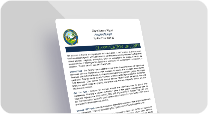 City of Laguna Niguel Adopted Budget For Fiscal Year 2024‐25 CLASSIFICATION OF FUNDS The accounts of the City are organized on the basis of funds. A fund is defined as an independent fiscal and accounting entity with a self-balancing set of accounts recording resources, together with all related liabilities, obligations, and equities, which are segregated for the purpose of carrying out specific activities or attaining certain objectives in accordance with special regulations, restrictions, or limitations. The City currently uses the following funds: General Fund - The General Fund is used to account for the financial resources and expenditures associated with most City operations where revenue is not required to be recorded in a separate fund. Revenues collected in the General Fund are not restricted as to the program or purpose they may be spent upon. They are derived primarily from taxes which account for approximately 89% of all General Fund revenues. Other General Fund revenue sources include licenses and permits, fines and forfeitures, use of money and property, intergovernmental revenues, charges for services, and other miscellaneous revenues. Gas Tax Fund - Accounts for revenues received and expenditures made for general street maintenance. Financing is provided by the City’s share of state gasoline taxes collected under the Street and Highway Code, Sections 2103, 2105, 2106, 2107 and 2107.5. Sections 2103, 2105, 2106, and 2107 revenue can be used for street maintenance and construction, while Section 2107.5 revenue is restricted to street engineering activities. Measure “M2” Fund - Accounts for revenues received and expenditures made for street improvement and maintenance. Financing is provided by the City’s allocation of County Measure M2 funds. Ai r Quality Improvement Fund - Accounts for revenues received under AB2766 and expenditures made for air quality improvements. AB2766 was enacted to authorize air pollution control districts to impose fees on motor vehicles. The California Department of Motor Vehicles collects the fees by assessing an amount on each registered vehicle in the South Coast District. This fee is distributed by the South Coast Air Quality Management District to local governments on a prorated basis based on population in the area. Law Enforcement Fund - Accounts for various law enforcement revenues received and expenditures made for certain law enforcement and crime prevention expenditures in the Police Services Department. Financing is provided by the State of California’s Citizens Options for Public Safety (COPS) program and the Regional Narcotics Suppression Program. Community Development Block Grant Fund - Accounts for revenues received and expenditures made for Community Development Block Grant eligible grants and capital projects. Financing is provided by the U.S. Department of Housing and Urban Development. 117