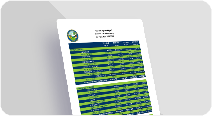 City of Laguna Niguel General Fund Summary For Fiscal Year 2024‐2025 2021‐2022 2022‐2023 2023‐2024 2024‐2025 Actual Actual Budget Adopted REVENUE SUMMARY 14,518,028 14,818,183 15,026,000 14,950,000 SALES TAXES 25,292,654 27,072,457 27,299,000 28,843,960 PROPERTY TAXES 1,161,039 670,076 645,000 660,000 OTHER TAXES 2,272,908 2,450,328 2,475,000 2,550,000 FRANCHISE FEES (1,972,354) 1,340,983 1,730,000 1,550,000 INTEREST INCOME 601,684 400,866 495,000 505,000 FINES & FORFEITURES 4,192,835 4,104,462 6,290,175 3,809,282 COMM. DEV. REVENUE 412,097 436,322 349,784 582,475 PUBLIC WORKS REVENUE 1,094,425 1,211,848 1,222,051 1,353,950 PARKS & RECREATION REVENUE 466,835 931,801 175,170 459,670 MISCELLANEOUS REVENUE 48,040,151 53,437,326 55,707,180 55,264,337 TOTAL REVENUE 278,326 38,705 ‐ ‐ TRANSFERS IN 48,318,477 53,437,326 55,745,885 55,264,337 TOTAL REVENUES & TRANSFERS IN EXPENDITURE SUMMARY 288,743 411,217 351,969 352,072 CITY COUNCIL 1,245,533 1,382,140 1,493,371 1,705,381 ADMINISTRATION 422,308 452,343 474,929 531,940 CITY CLERK 497,452 547,333 425,000 450,000 CITY ATTORNEY 1,028,649 1,126,453 1,178,541 1,219,596 FINANCE 2,515,553 7,607,841 2,807,651 3,203,954 NON‐DEPARTMENTAL & I.T. 16,060,013 16,606,265 18,546,963 18,616,745 PUBLIC SAFETY 4,643,959 4,062,958 5,867,733 5,295,276 COMMUNITY DEVELOPMENT 14,955,070 14,505,011 16,297,541 16,283,279 PUBLIC WORKS 4,336,283 4,903,323 5,135,919 5,148,056 PARKS & RECREATION 45,993,563 51,604,884 52,579,617 52,806,299 TOTAL EXPENDITURES 181,450 3,341 251,384 1,341,038 TRANSFERS OUT 46,175,013 51,608,225 52,831,001 54,147,337 TOTAL EXPENDITURES & TRANSFERS OUT 2,143,464 1,829,101 2,914,884 1,117,000 REVENUE OVER/(UNDER) EXPENDITURES INFRASTRUCTURE RESERVES COMMITMENT 2,143,464 1,829,101 2,914,884 1,117,000 ‐ ‐ (3,329,101) (917,000) RESERVES DRAW DOWN FOR LA PAZ ROAD NET INCREASE TO RESERVES 2,143,464 1,829,101 (414,217) 200,000 46,347,093 48,490,557 50,319,658 49,905,441 BEGINNING FUND BALANCE 48,490,557 50,319,658 49,905,441 50,105,441 ENDING FUND BALANCE SUMMARY OF EXPENSES BY FUNCTION SALARIES & BENEFITS 10,223,376 16,003,353 11,776,422 12,416,711 MATERIALS, SUPPLIES, & SERVICES 35,770,187 35,601,531 40,803,195 40,389,588 TRANSFERS OUT 181,450 3,341 251,384 1,341,038 TOTALS 46,175,013 51,608,225 52,831,001 54,147,337 13