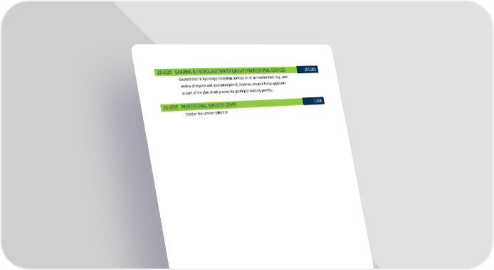 22‐6225 GRADING & HYDROLOGY/WATER QUALITY PROFESSIONAL SERVICES 295,000 ‐ Geotechnical & hydrology consulting services on an as‐needed basis (e.g., peer review of reports and associated plans). Expenses are paid for by applicants as part of the plan check process for grading or building permits. 25‐6725 PROFESSIONAL SERVICES‐OTHER 2,400 ‐ Citation fee service collection 62