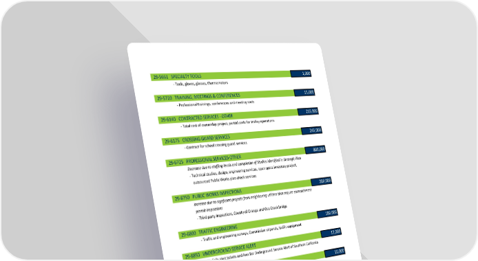 29‐5661 SPECIALTY TOOLS 1,000 ‐ Tools, gloves, glasses, thermometers 29‐5720 TRAINING, MEETINGS & CONFERENCES 15,000 ‐ Professional trainings, conferences and meeting costs 29‐6140 CONTRACTED SERVICES ‐ OTHER 215,000 ‐ Total cost of ownership project, partial costs for trolley operations 29‐6175 CROSSING GUARD SERVICES 245,000 ‐ Contract for school crossing guard services 29‐6725 PROFESSIONAL SERVICES‐OTHER 800,000 Decrease due to staffing levels and completion of Studies identified in Strategic Plan ‐ Technical studies, design, engineering services, open space inventory project, outsourced Public Works plan check services 29‐6750 PUBLIC WORKS INSPECTIONS 200,000 Increase due to signficant projects from neighboring utilities that require encroachment permit inspections ‐ Third party inspections, County of Orange and Oso Creek bridge 29‐6800 TRAFFIC ENGINEERING 180,000 ‐ Traffic and engineering surveys, Commission stipends, traffic equipment 29‐6850 UNDERGROUND SERVICE ALERT 12,000 ‐ Dig Safe alert tickets and fees for Underground Service Alert of Southern California 29‐7250 FURNITURE & EQUIPMENT 10,000 ‐ Purchase and replacement of furniture and equipment 31‐5370 MAINTENANCE ‐ LANDSCAPE 290,000 ‐ Landscape maintenance in medians, incidental repair work, public right‐of‐way landscape medians 31‐5385 MAINTENANCE ‐ SIGNALS 371,525 Decrease due to historical trend and expectations for materials ‐ Preventative, routine, and emergency maintenance to traffic signals 31‐5392 STREET SWEEPING 340,000 ‐ Contract costs for City‐wide street sweeping services 70