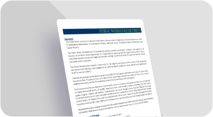 PUBLIC WORKS DEPARTMENT Description The Public Works function includes the Public Works Administration & Engineering, Streets Maintenance, Parks & Landscaping Maintenance, Environmental Services, Metrolink Station, Building & Facility Maintenance, and Capital Projects. The Public Works Administration & Engineering program provides coordination, direction, and support to all divisions of the Public Works Department. It is responsible for ensuring that City Capital Improvement Projects and private projects comply with legal requirements and high standards of quality through development review and public works inspections. The Streets Maintenance program is responsible for the ongoing maintenance of the streets, traffic signals and City-owned street lighting, street sweeping of all public residential streets and major arterials, and maintenance of all City-owned medians. The Parks & Landscaping Maintenance program provides for the ongoing maintenance and repair of Crown Valley Community Park, Chapparosa Park, La Paz Sports Park, Laguna Niguel Skateboard and Soccer Park, all City-owned neighborhood parks, and for the maintenance of all City-owned slopes and open spaces. The Environmental Services division is responsible for various environmental programs the City must comply with including stormwater quality, air quality, hazardous waste, and hazardous material reporting. The stormwater quality program includes all activities required under the South Orange County National Pollutant Discharge Elimination System permit and stormwater quality directives mandated by the San Diego Regional Water Quality Control Board. Air Quality falls under the requirements of the South Coast Air Quality Management District. Hazardous material falls under CalRecycle mandates and is reported to the County of Orange Health Care Agency. The Metrolink Station program provides for the maintenance and repair of the Metrolink Station, and the Building and Facilities Maintenance program provides for the maintenance and repair of all City-owned facilities. Prior Year Accomplishments • Processed and approved 456 encroachment permits. • Deployed vehicle and bicycle video detection at 13 intersections. • Implemented enhanced bike lanes on Aliso Creek Road. • Obtained approximately $15.5 million in federal and state grant funding to stabilize the land under La Paz Road, enhance mobility and install permanent street repairs. • Developed standards for Micro-Trenching and updated standards for Utility Trenching. • Completed many critical infrastructure projects, including the Residential Annual Resurfacing Program (Slurry Seal Project) in Zones 3 and 4, and Marina Hills Drive Resurfacing Project from Niguel Road to Golden Lantern. • Completed replacement of roofing at the Sea Country Senior and Community Center. • Completed over 10,000 square feet of concrete infrastructure repairs related to sidewalks, drive approaches, cross-gutters and drainage structures. • Completed Phase I–Parks and Trails of the Total Cost of Ownership program and launched work order system. • Completed the Crown Valley Park Parking Study with recommendations. • Completed second year of the award-winning five-year Salt Creek Wetland Restoration Project. 64