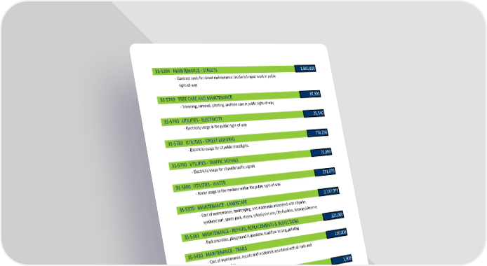 31‐5394 MAINTENANCE ‐ STREETS 1,865,830 ‐ Contract costs for street maintenance, incidental repair work in public right‐of‐way 31‐5740 TREE CARE AND MAINTENANCE 87,500 ‐ Trimming, removal, planting, and tree care in public right‐of‐way 31‐5760 UTILITIES ‐ ELECTRICITY 20,540 ‐ Electricity usage in the public right‐of‐way 31‐5780 UTILITIES ‐ STREET LIGHTING 770,250 ‐ Electricity usage for citywide streetlights 31‐5790 UTILITIES ‐ TRAFFIC SIGNALS 71,890 ‐ Electricity usage for citywide traffic signals 31‐5800 UTILITIES ‐ WATER 231,075 ‐ Water usage to the medians within the public right‐of‐way 35‐5370 MAINTENANCE ‐ LANDSCAPE 2,137,071 ‐ Cost of maintenance, landscaping, and incidentals associated with all parks, synthetic turf, sports park, slopes, school joint use, City facilities, Botanical Reserve 35‐5383 MAINTENANCE ‐ REPAIRS, REPLACEMENTS & INSPECTIONS 225,000 ‐ Park amenities, playground inspections, backflow testing, painting 35‐5410 MAINTENANCE ‐ TRAILS 110,000 ‐ Cost of maintenance, repairs and incidentals associated with all trails and park parking lots 35‐5440 MEMBERSHIP & DUES 1,500 ‐ Memberships for Parks & Landscape Maintenance staff 35‐5720 TRAINING, MEETINGS & CONFERENCES 1,500 ‐ Professional Training 35‐5740 TREE CARE AND MAINTENANCE 135,000 ‐ Trimming, removal, planting, and tree care in City parks 35‐5760 UTILITIES ‐ ELECTRICITY 374,000 ‐ Electricity usage in City parks 71