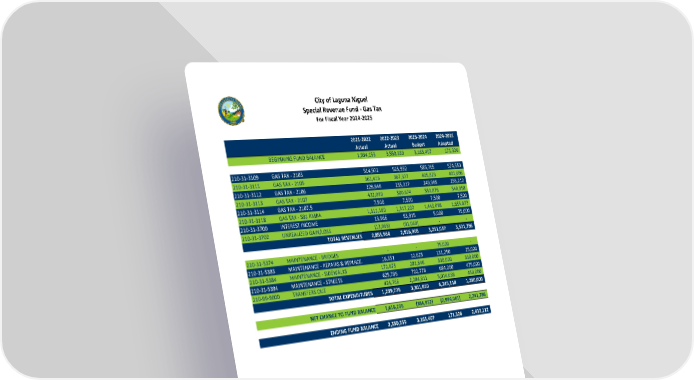 City of Laguna Niguel Special Revenue Fund ‐ Gas Tax For Fiscal Year 2024‐2025 2021‐2022 2022‐2023 2023‐2024 2024‐2025 Actual Actual Budget Adopted BEGINNING FUND BALANCE 1,934,153 3,550,359 3,165,407 171,326 210‐31‐3109 GAS TAX ‐ 2103 514,972 525,992 585,765 574,553 210‐31‐3111 GAS TAX ‐ 2105 361,416 367,377 405,823 401,686 210‐31‐3112 GAS TAX ‐ 2106 228,848 235,317 249,985 258,212 210‐31‐3113 GAS TAX ‐ 2107 432,090 500,674 553,876 548,958 210‐31‐3114 GAS TAX ‐ 2107.5 7,500 7,500 7,500 7,500 210‐31‐3118 GAS TAX ‐ SB1 RMRA 1,311,160 1,317,202 1,443,088 1,655,877 210‐31‐3700 INTEREST INCOME 13,966 53,915 5,000 75,000 210‐31‐3702 UNREALIZED GAIN/LOSS (13,968) (91,069) ‐ ‐ TOTAL REVENUES 2,855,984 2,916,908 3,251,037 3,521,786 210‐31‐5374 MAINTENANCE ‐ BRIDGES ‐ ‐ 75,000 ‐ 210‐31‐5383 MAINTENANCE ‐ REPAIRS & REPLACE. 16,351 12,625 131,250 25,000 210‐31‐5384 MAINTENANCE ‐ SIDEWALKS 172,875 281,646 330,000 330,000 210‐31‐5394 MAINTENANCE ‐ STREETS 625,786 722,778 694,200 475,000 210‐99‐9000 TRANSFERS OUT 424,766 2,284,811 5,014,668 450,000 TOTAL EXPENDITURES 1,239,778 3,301,860 6,245,118 1,280,000 NET CHANGE TO FUND BALANCE 1,616,206 (384,952) (2,994,081) 2,241,786 ENDING FUND BALANCE 3,550,359 3,165,407 171,326 2,413,112 89