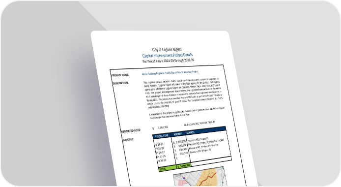 City of Laguna Niguel Capital Improvement Project Details For Fiscal Years 2024-25 through 2028-29 PROJECT NAME: Alicia Parkway Regional Traffic Signal Synchronization Project DESCRIPTION: This regional project includes traffic signal synchronization and equipment upgrades on Alicia Parkway. Laguna Niguel will serve as the lead agency for the project. Participating agencies in addition to Laguna Niguel are Caltrans, Mission Viejo, Aliso Viejo, and Laguna Hills. The project encompasses synchronizing the signalized intersections on the entire 10.5 mile length of Alicia Parkway in addition to several offset signalized intersections. In Spring 2023, this project was awarded Measure M2 funds as part of the Project P Program, which covers the majority of project costs. The budgeted amount includes the City's requiredmatchfunding. Completion of this project supports City Council Goal 4 (Infrastructure and Technology) of theStrategicPlanImplementationActionPlan. ESTIMATED COST: $ 3,999,355 GL Account: 300-70-6130-7025-07 FUNDING: FISCAL YEAR AMOUNT SOURCE FY 24-25 $ 2,055,926 Measure M2 (Project P) FY 25-26 $ 880, 000 Measure M2 (Project P) / Gas Tax / AQMD FY 26-27 $ 830, 309 Measure M2 (Project P) / Gas Tax FY 27-28 $ 233, 120 Measure M2 (Project P) FY 28-29 $ - TOTAL $ 3,999,355 112