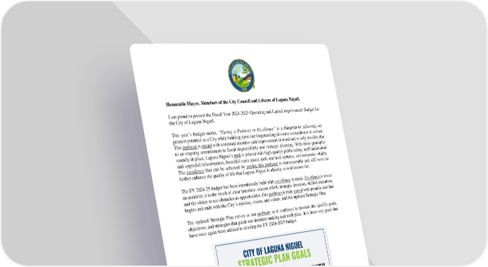 Honorable Mayor, Members of the City Council and Citizens of Laguna Niguel, I am proud to present the Fiscal Year 2024-2025 Operating and Capital Improvement Budget for the City of Laguna Niguel. This year’s budget motto, “Paving a Pathway to Excellence” is a blueprint to achieving our greatest potential as a City while building upon our longstanding devotion to excellence in service. This pathway is paved with continual attention and improvement in mind and is only possible due to an ongoing commitment to fiscal responsibility and strategic planning. With these principles soundly in place, Laguna Niguel’s path is primed with high-quality public safety, well-maintained and upgraded infrastructure, beautiful open space, park and trail systems, and economic vitality. The excellence that can be achieved by paving this pathway is immeasurable and will serve to further enhance the quality of life that Laguna Niguel is already so well known for. The FY 2024-25 budget has been intentionally built with excellence in mind. Excellence is never an accident; it is the result of clear intention, sincere effort, strategic direction, skillful execution, and the vision to see obstacles as opportunities. Our pathway is truly paved with promise and that begins and ends with the City’s mission, vision, and values, and the updated Strategic Plan. The updated Strategic Plan serves as our pathway as it continues to provide the specific goals, objectives, and strategies that guide our decision making and work plan. It is these very goals that have once again been utilized to develop the FY 2024-2025 budget. i