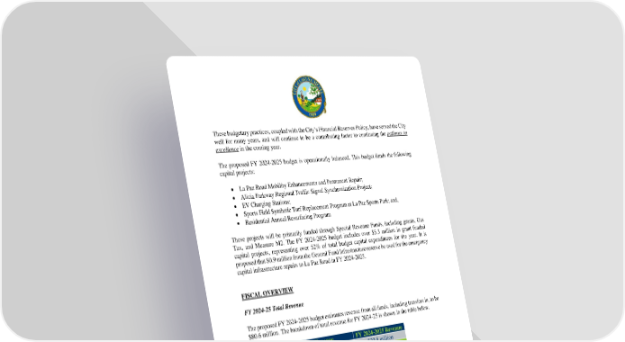 These budgetary practices, coupled with the City’s Financial Reserves Policy, have served the City well for many years, and will continue to be a contributing factor to continuing the pathway to excellence in the coming year. The proposed FY 2024-2025 budget is operationally balanced. This budget funds the following capital projects: • La Paz Road Mobility Enhancements and Permanent Repair; • Alicia Parkway Regional Traffic Signal Synchronization Project; • EV Charging Stations; • Sports Field Synthetic Turf Replacement Program at La Paz Sports Park; and, • Residential Annual Resurfacing Program These projects will be primarily funded through Special Revenue Funds, including grants, Gas Tax, and Measure M2. The FY 2024-2025 budget includes over $5.3 million in grant funded capital projects, representing over 52% of total budget capital expenditures for the year. It is proposed that $0.9 million from the General Fund Infrastructure reserve be used for the emergency capital infrastructure repairs to La Paz Road in FY 2024-2025. FISCAL OVERVIEW FY 2024-25 Total Revenue The proposed FY 2024-2025 budget estimates revenue from all funds, including transfers in, to be $80.6 million. The breakdown of total revenue for FY 2024-25 is shown in the table below. Total Budget Revenue FY 2024-2025 Revenue Revenue (All Funds) $70.8 million Transfers In $9.8 million TOTAL REVENUE $80.6 million The proposed FY 2024-25 total revenue is a $12.8 million increase from the previous year’s adopted budget. This increase is predominantly due to additional grant funds received ($6.4 million higher) and higher transfers in, to fund capital projects ($2.9 million higher). This budget does include an increase to General Fund revenues of $2.7 million, primarily due to a $2.0 million increase in property taxes. These revenue projections are conservative and are in-line with the City’s fiscal principles. iii